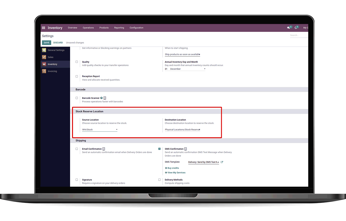 Under "Inventory" > "Configurations" > "Settings" user have to select source location and destination location to reserve stock.
