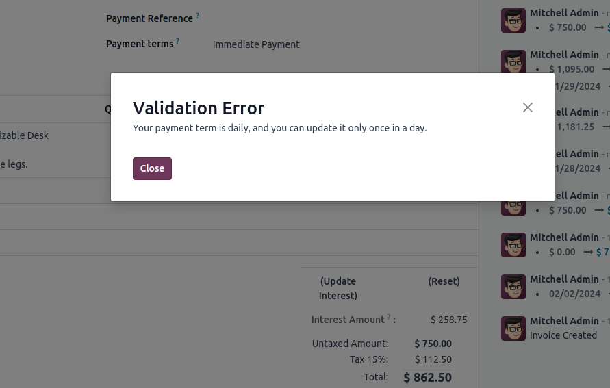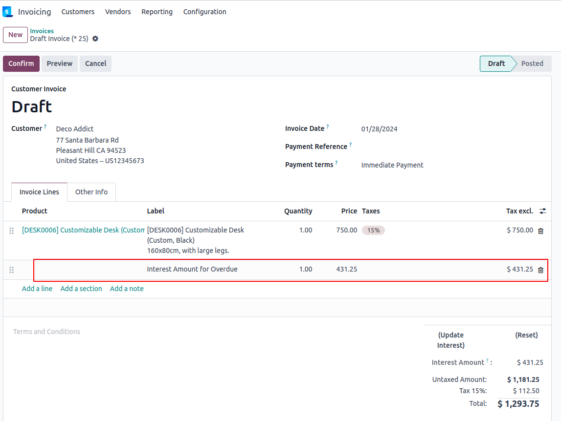 After the payment configuration we can use that payment term in invoice creation. Also set the invoice details ,use the update interest button to calculate.