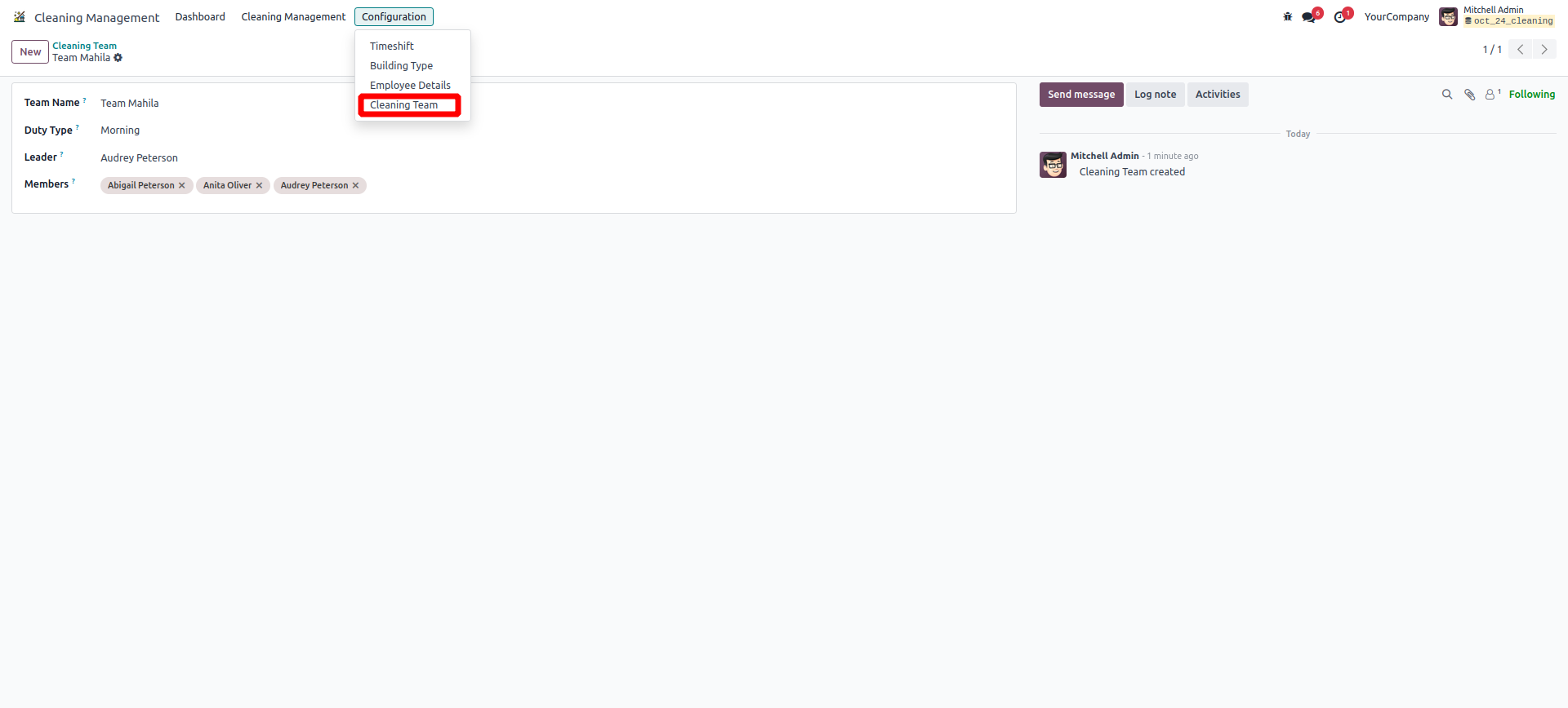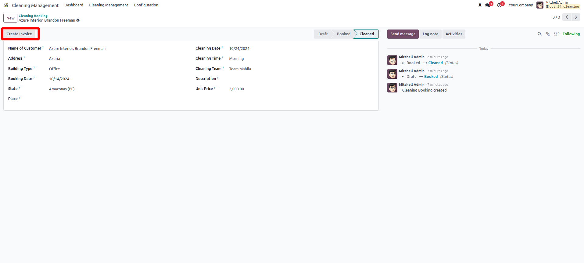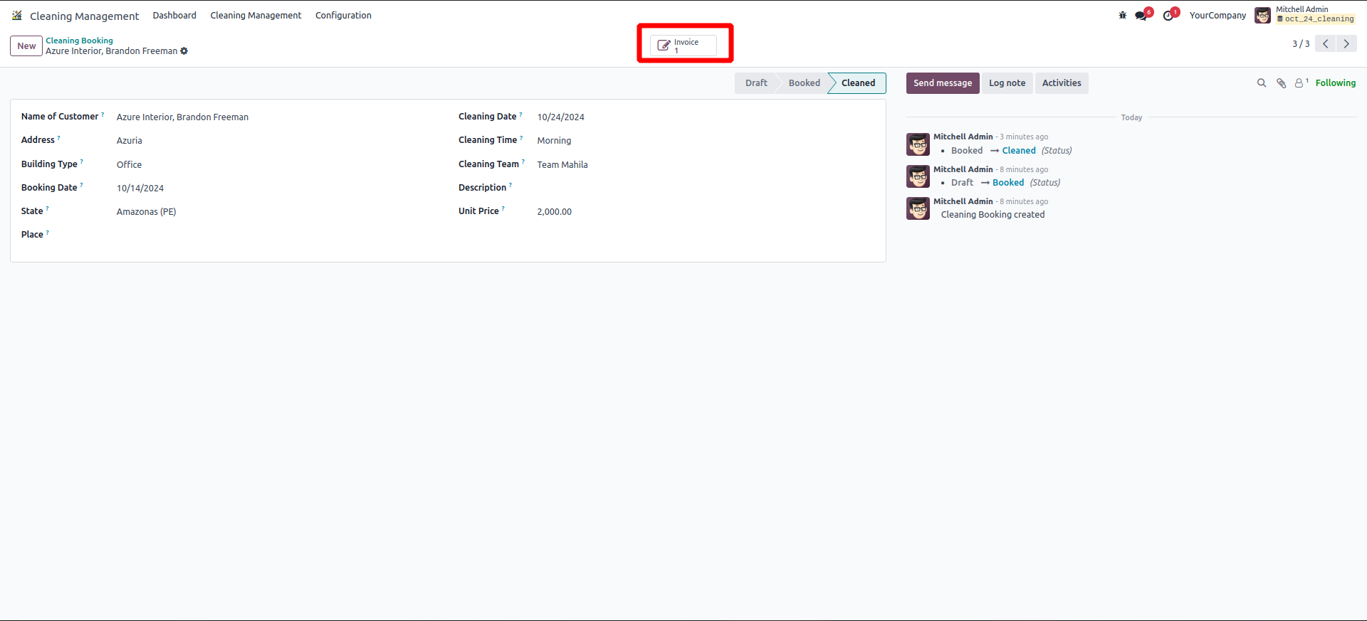 The Cleaning Management module in Odoo 17.0 is designed to help businesses manage their cleaning operations. It allows you to schedule cleaning tasks, assign them to staff, track progress, and maintain records of cleaning activities.