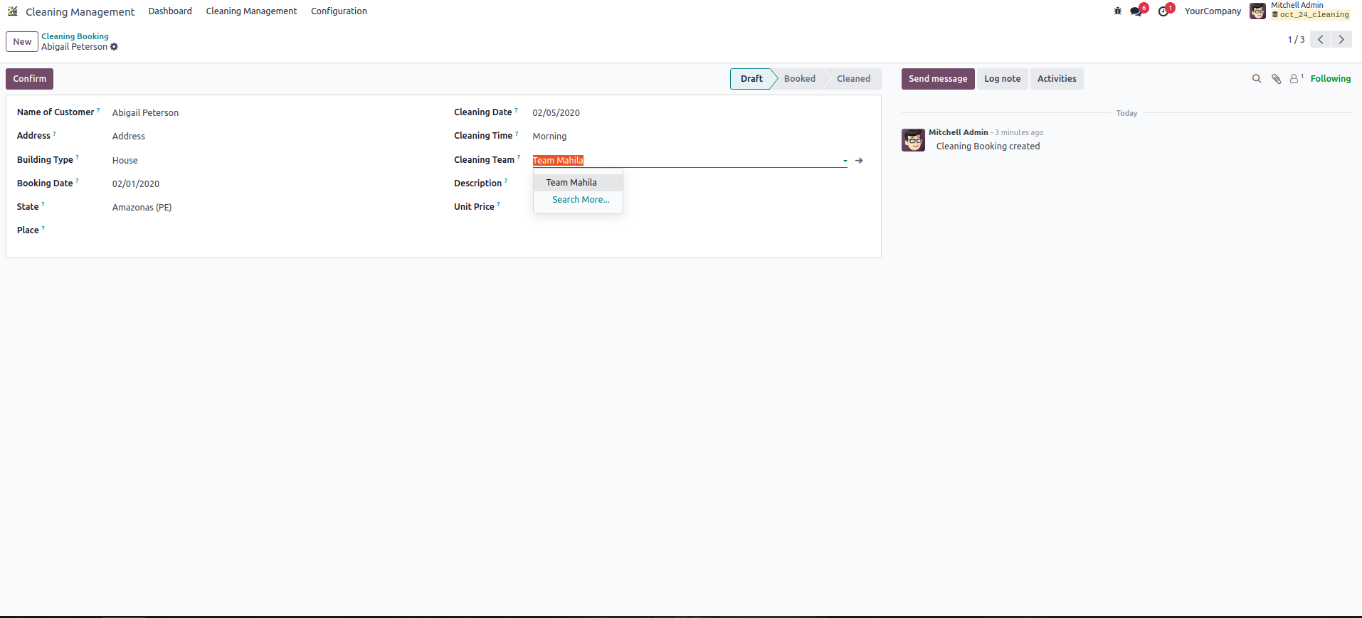 Cleaning Management -> Booking. Where all created bookings are listed, and you can also create a new booking here.