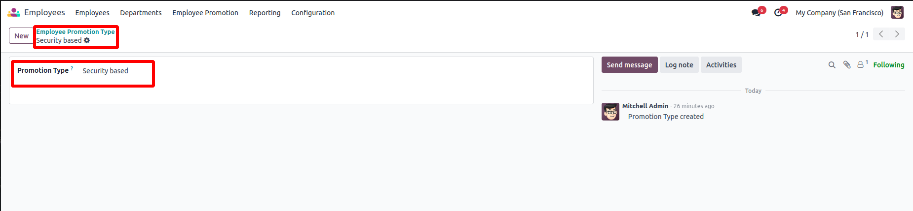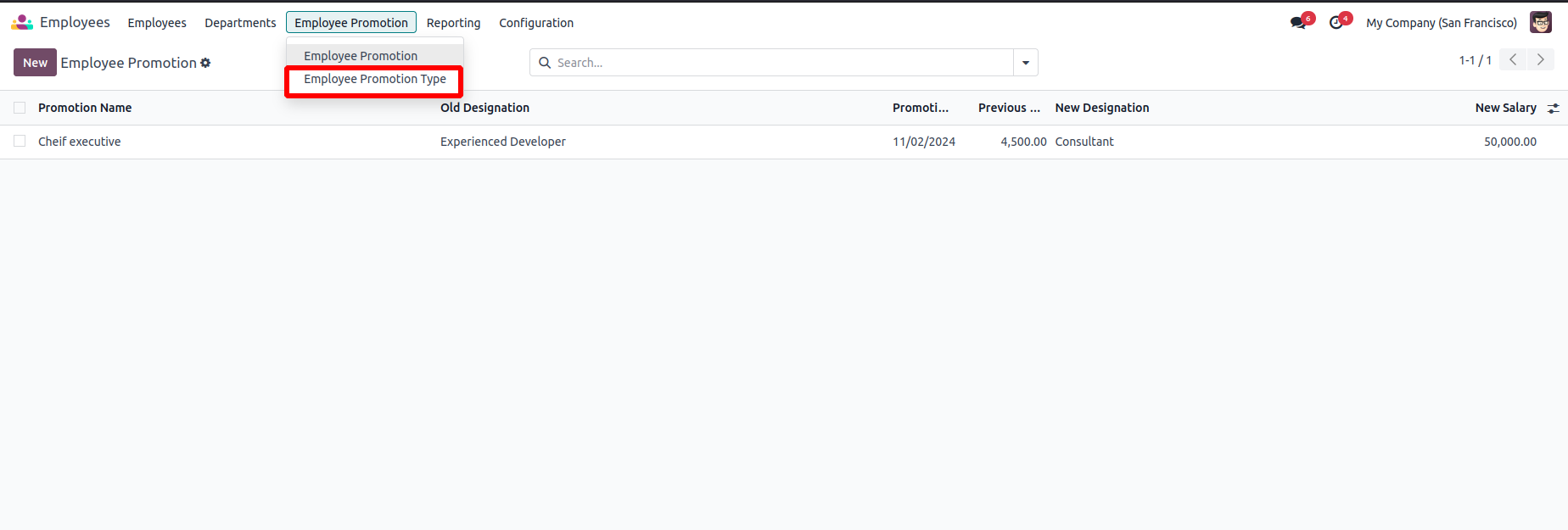 Go to Employees -> Employee Promotion ->Employee Promotion Type menu for creating the Promotion Types.