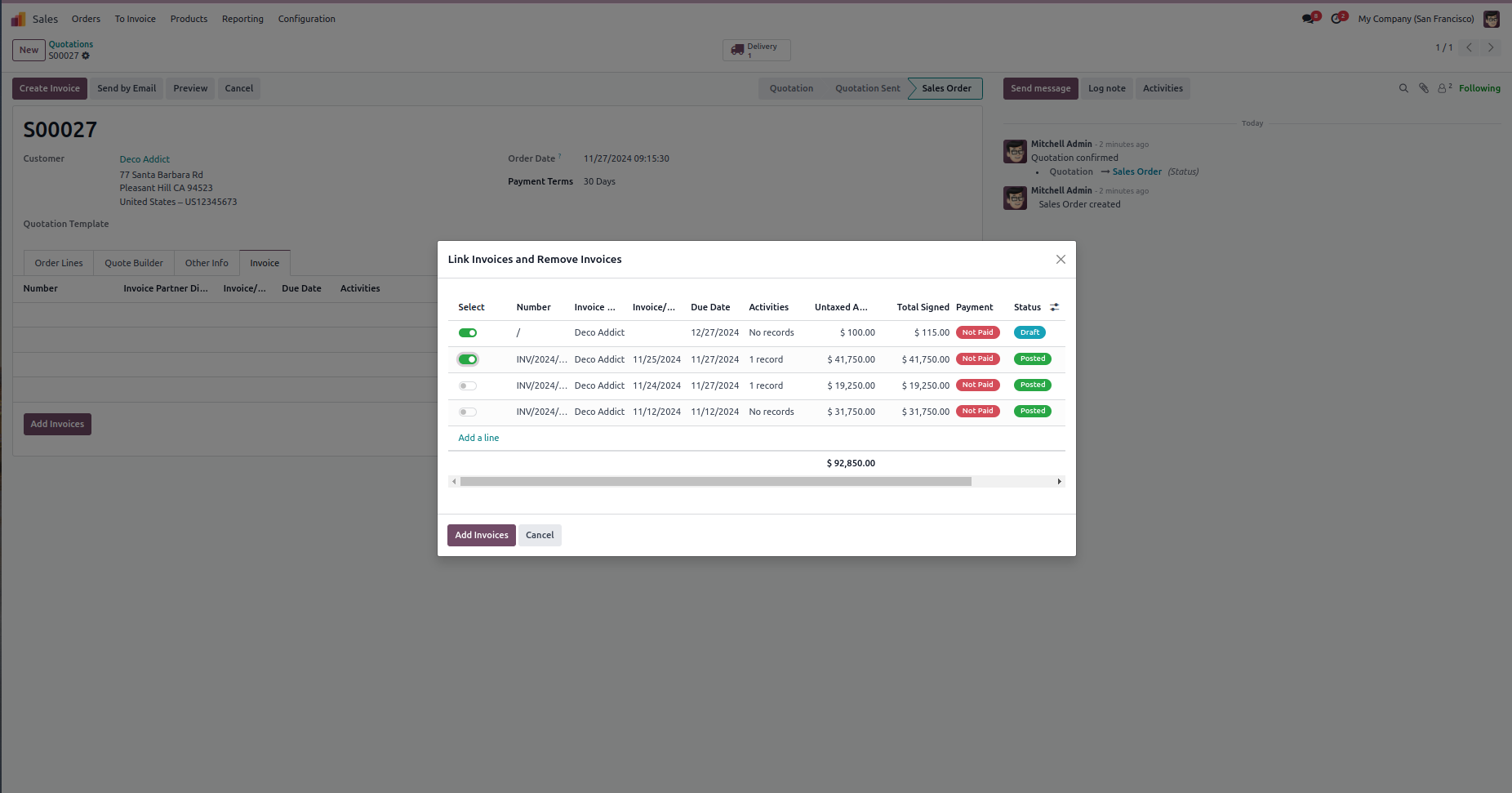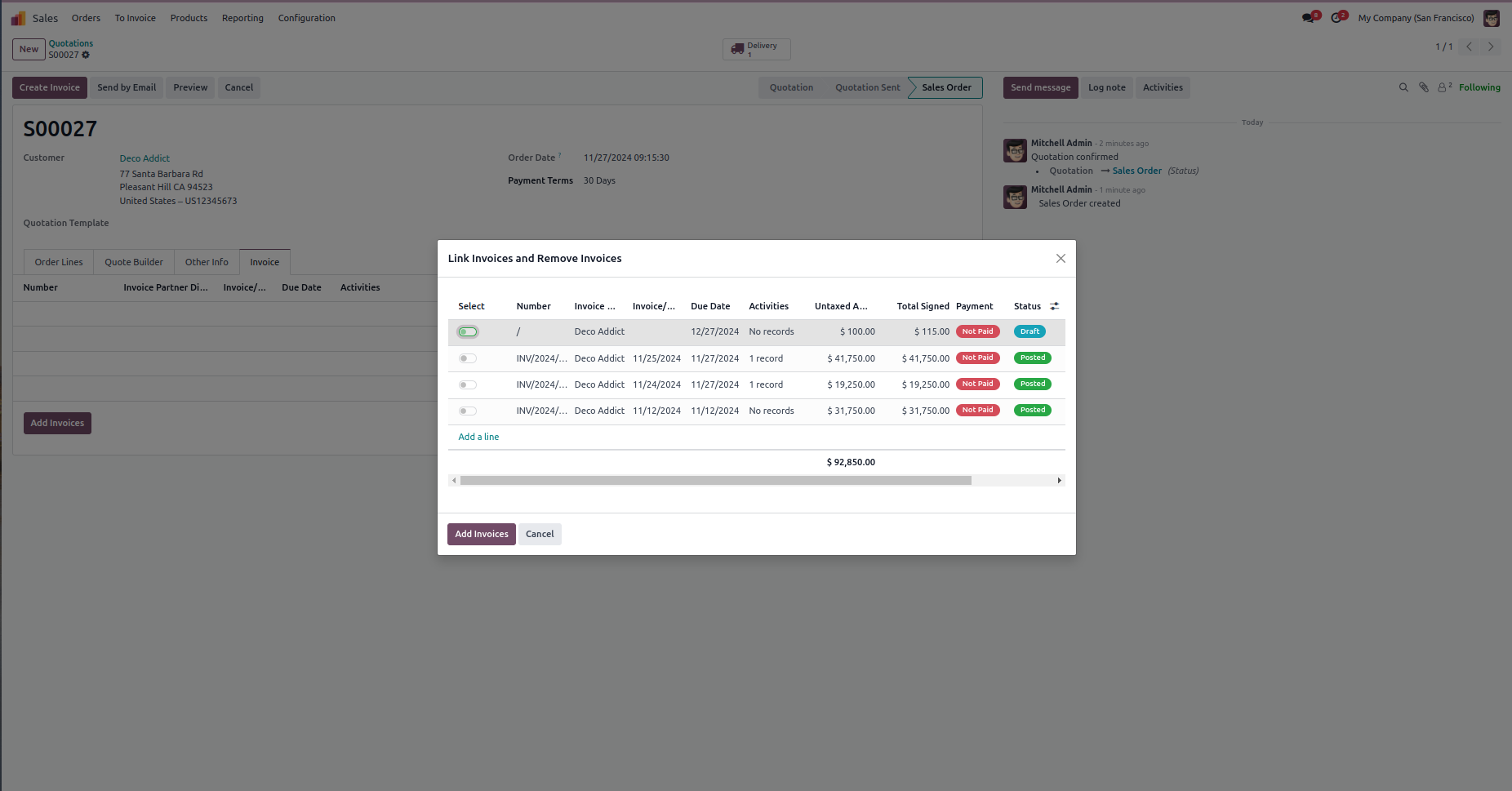 Click on the "Add Invoice" Button to link Invoices to the Sale Order.