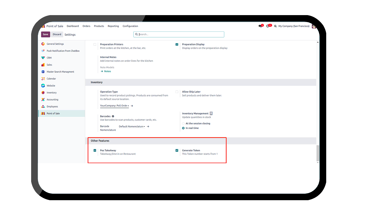 You can enable the Take-away feature from the boolean field in POS configuration settings. Also, you can enable the feature of tokens from here.