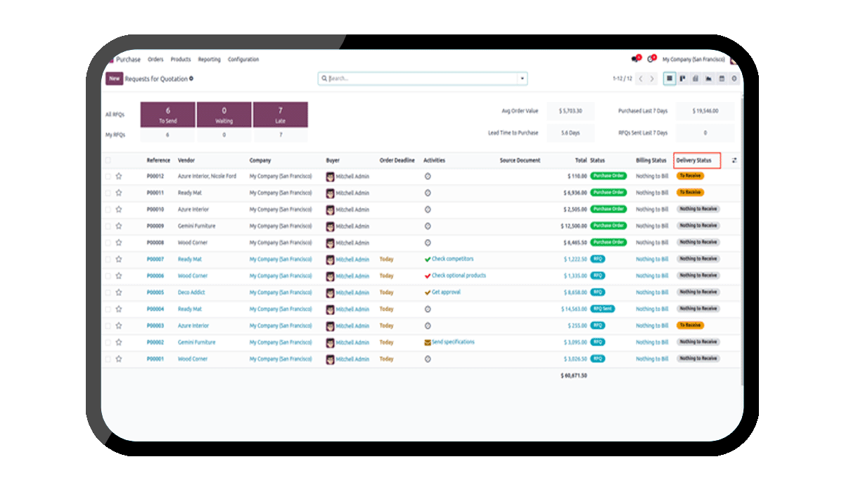 This module enables tracking of the delivery status for each purchase order, with the status displayed in both the tree view and form view of purchase orders. The available delivery statuses include: