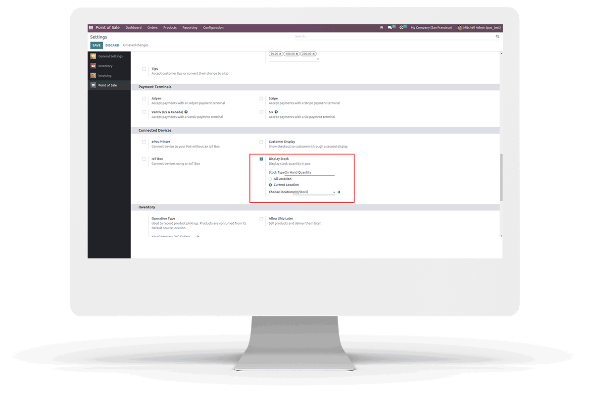 Go to Point Of Sale -> Configuration -> Settings -> Display Stock. By enabling this feature you need to choose stock type as well as Location.