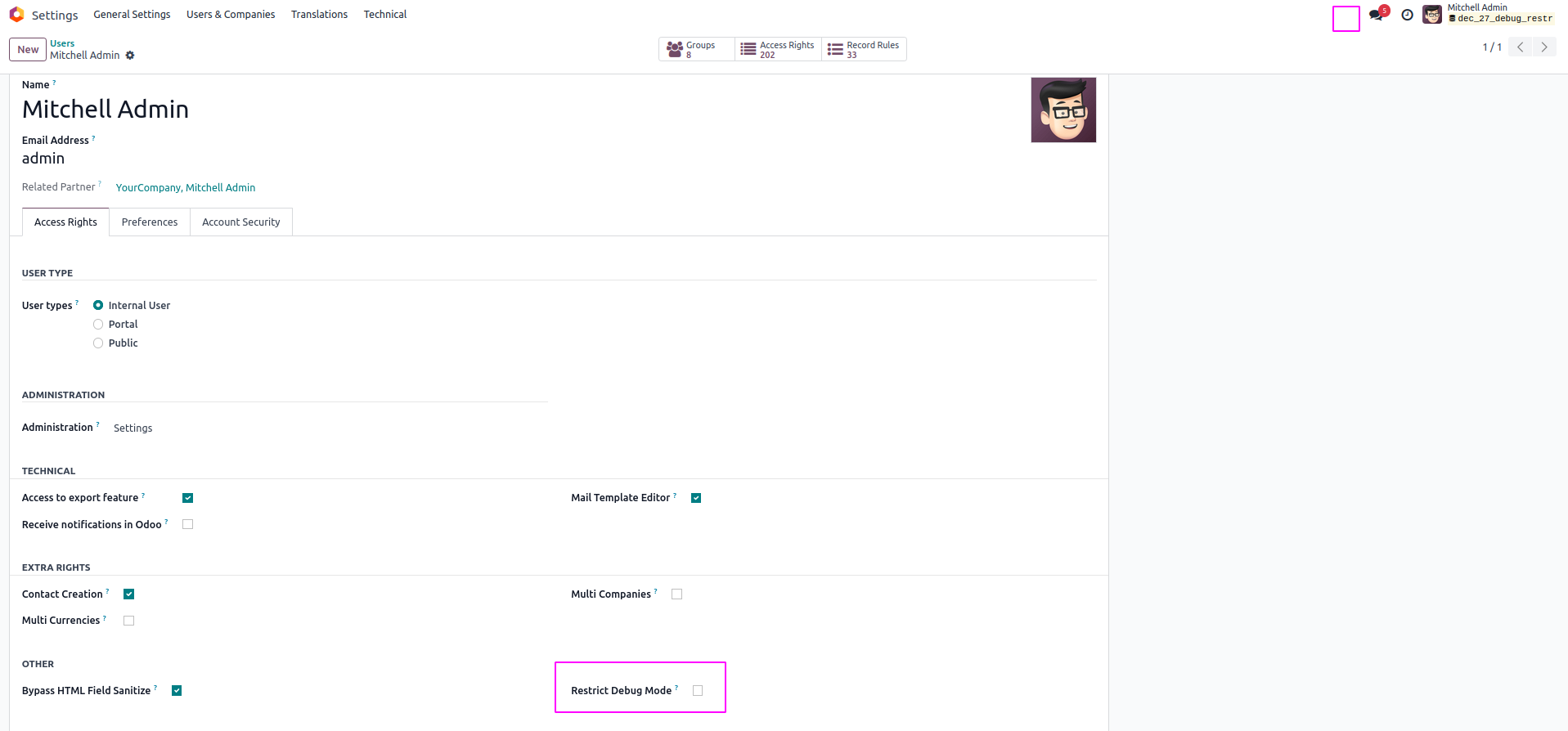 Enable/Disable Debug Mode Group for Specific Users.