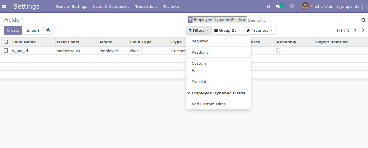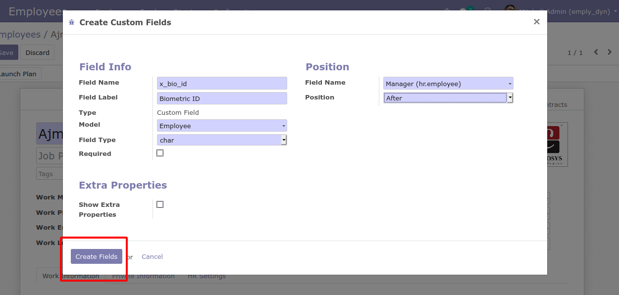 Employee Dynamic Fields module helps with easy creation of custom fields in employee without any coding. This module helps to add new fields on the employee form as per one's requirement. From the Employee menu, one can click create fields and can create a new custom field without any coding.