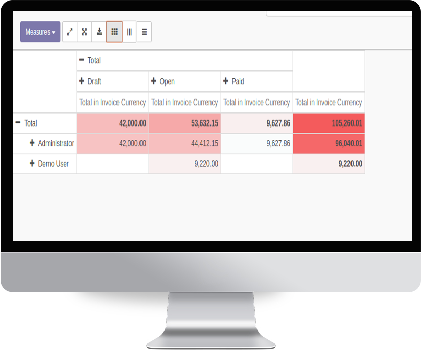 Heat map can be used to color the entries in the pivot view. The coloring will be in a format where the maximum value will be shown in a dark color and next largest value will be in a lighter color than the maximum one. This applies for all the values in the table.