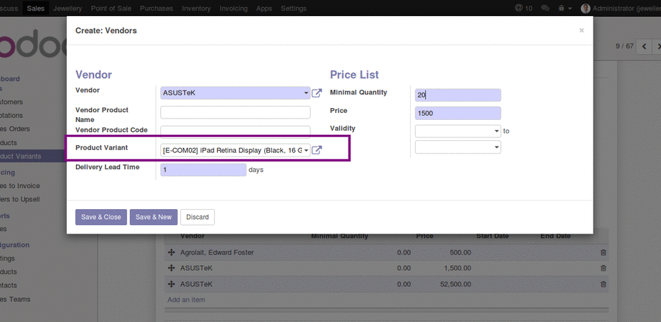 First, install the module and activate the product variants feature from product variants menu, Sales -> Sales -> Product Variants. Now open a product variant form, go to inventory tab. To set cost price, click on the Vendors section, a new field will be available there to set the cost price of the product.