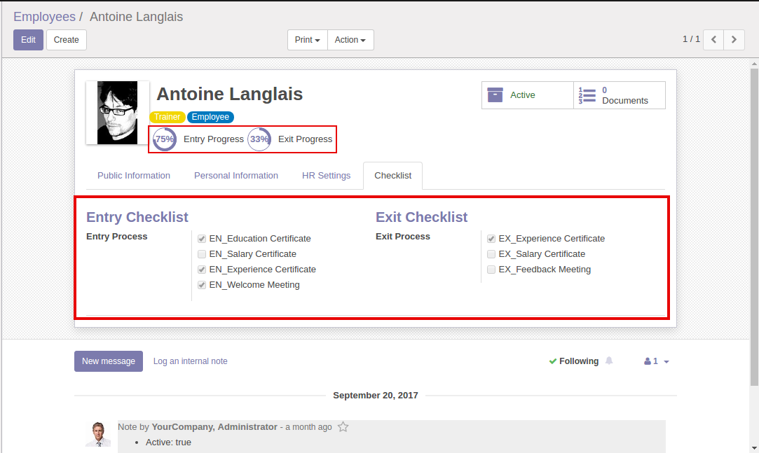 A well functioning human resource department will lay down a number procedure and process before an employee during joining/resigning time. It may be submission/Return of a certificate or attending a conference etc. A person has to undergo all these checklist items before being admitted/resigned. The module simplifies the process by providing you a checklist to mark the proceedings. It will also display the PercentPie of an individual completed in the checklist entries.