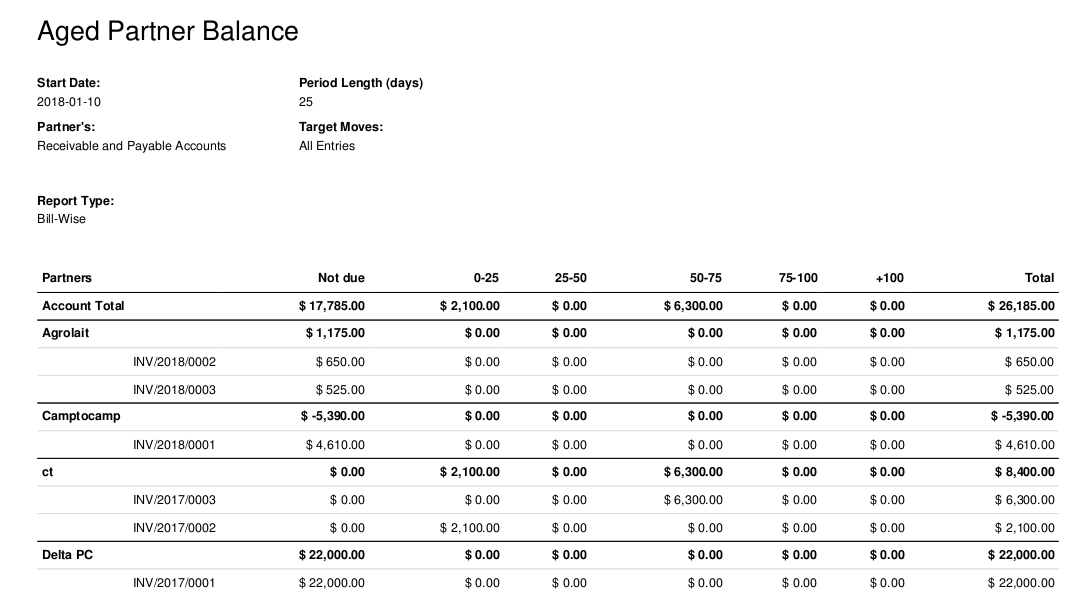 By default, Odoo doesn't have a bill-wise aged partner balance report. With this module, we can have a pdf report of bill-wise and customer-wise(Odoo's default) aged partner balance reports.