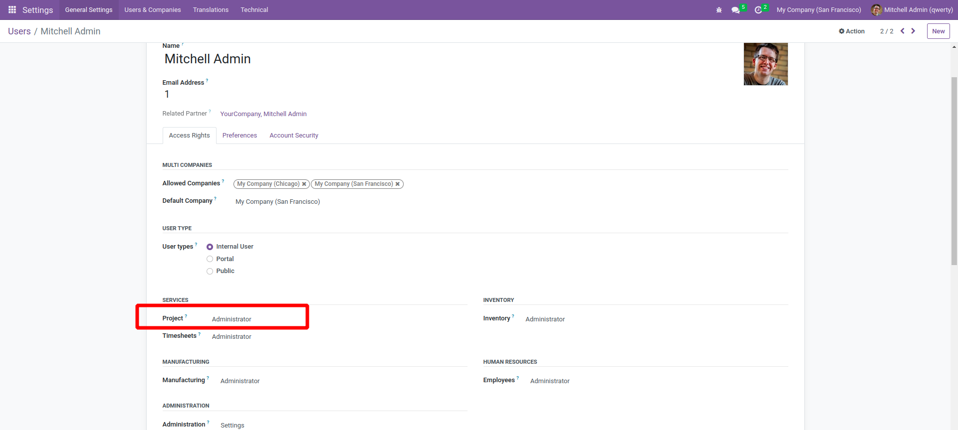 Go to Settings -> Users & Companies -> Users -> Project : Administrator