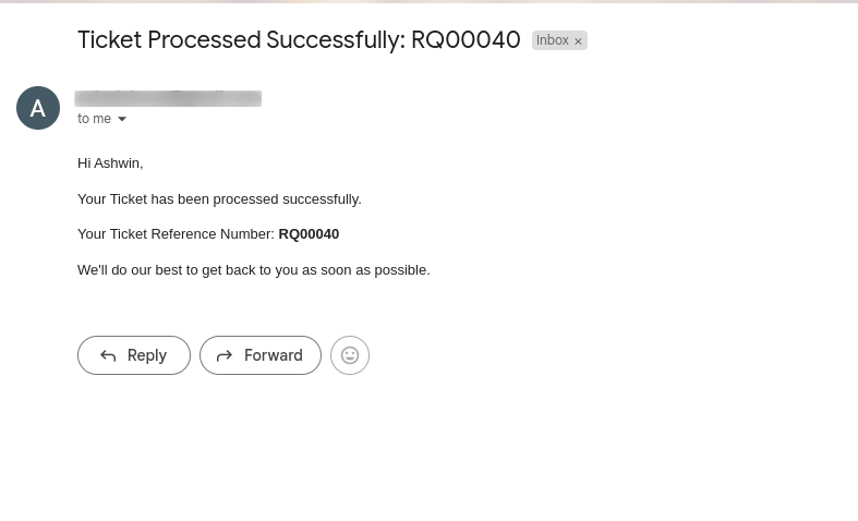If the support request is successfully created, an email will be sent to notify the user about the ticket, including its reference number.