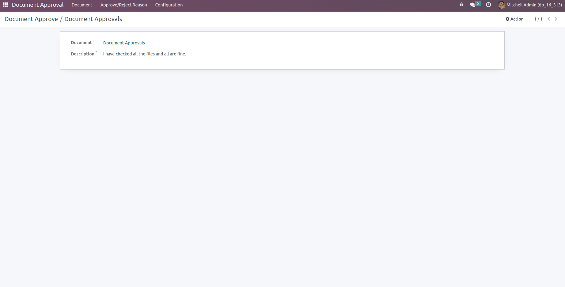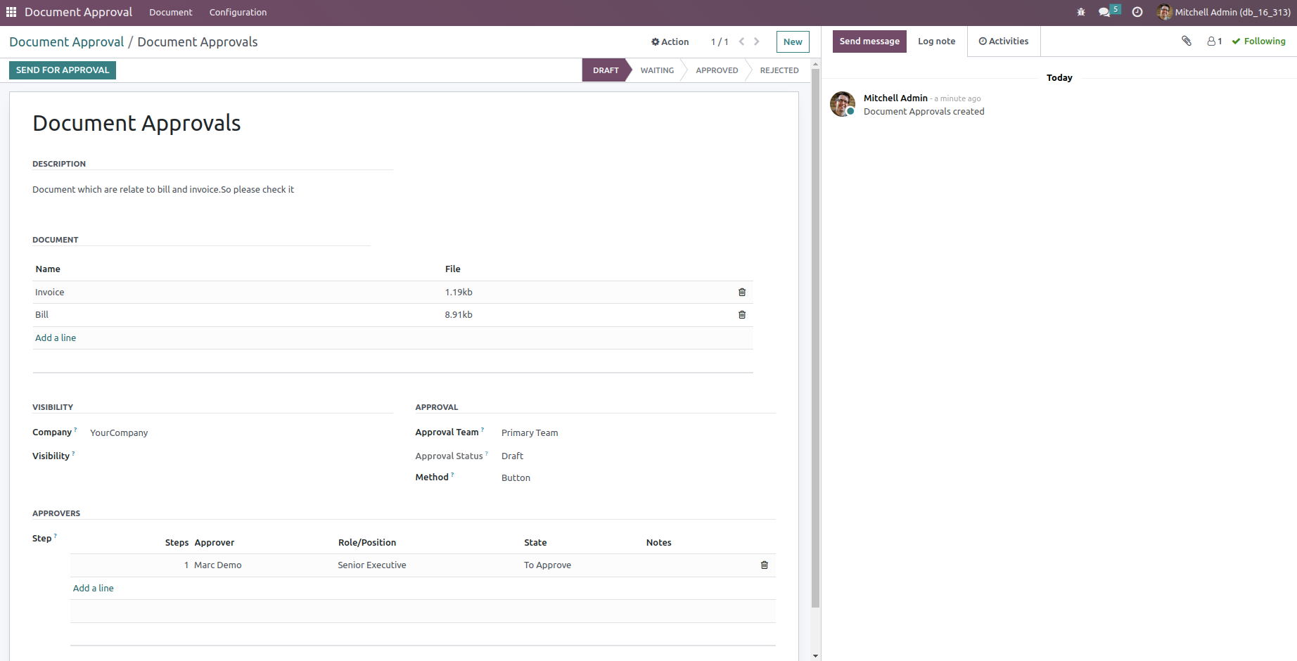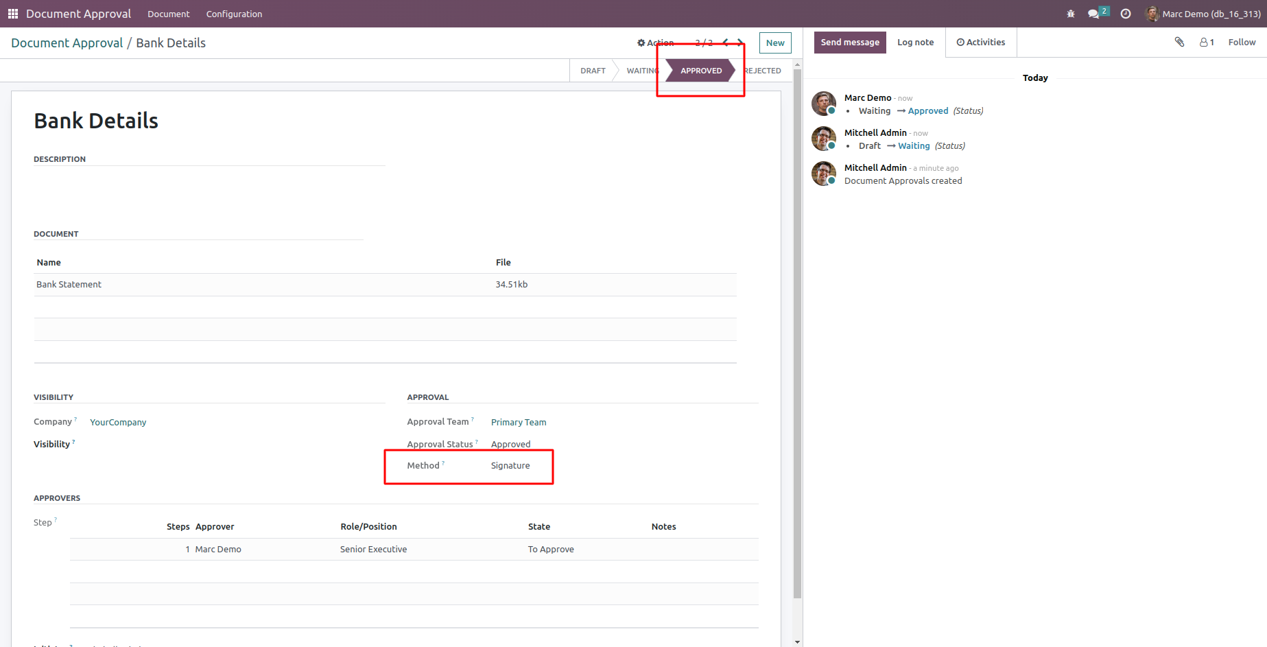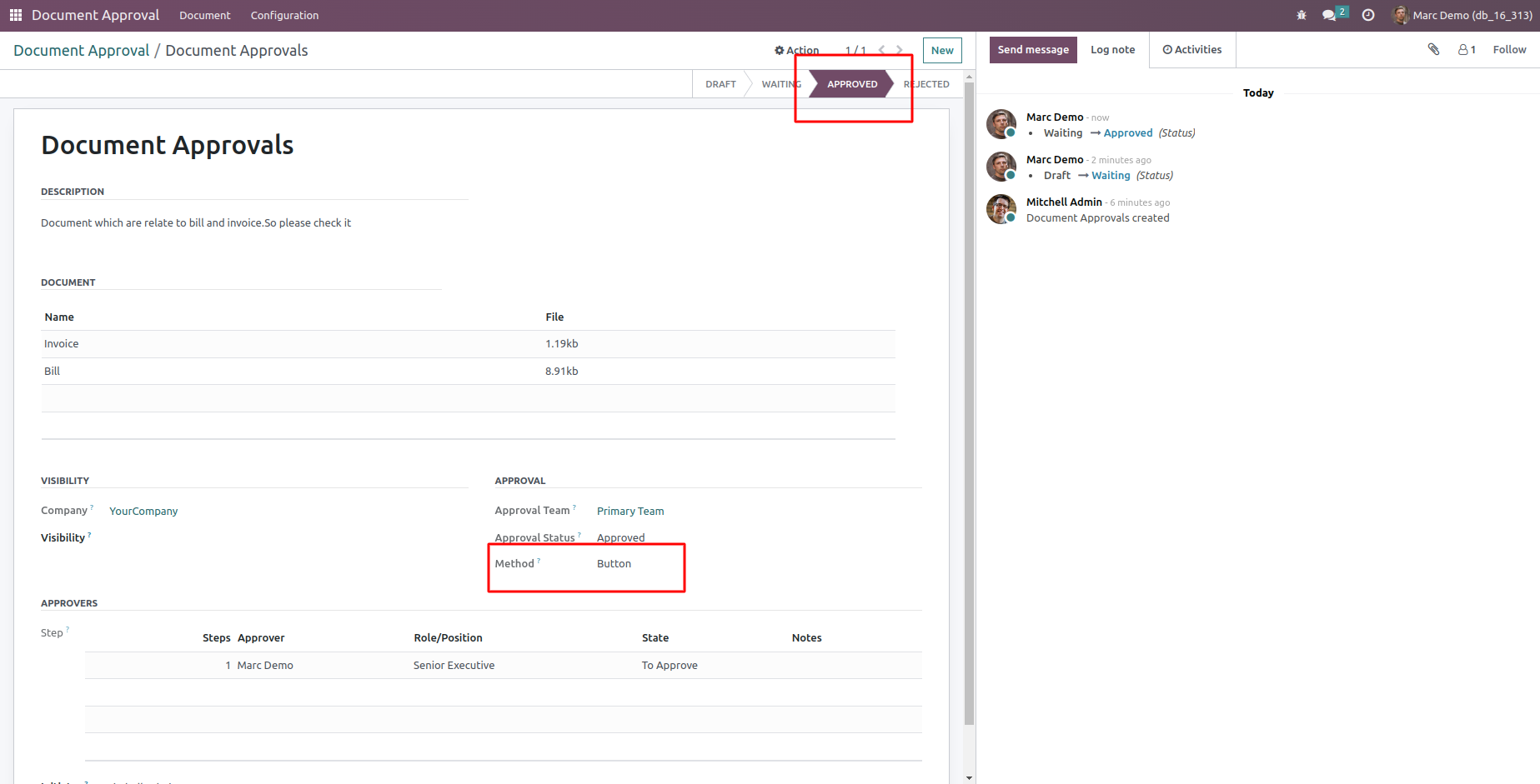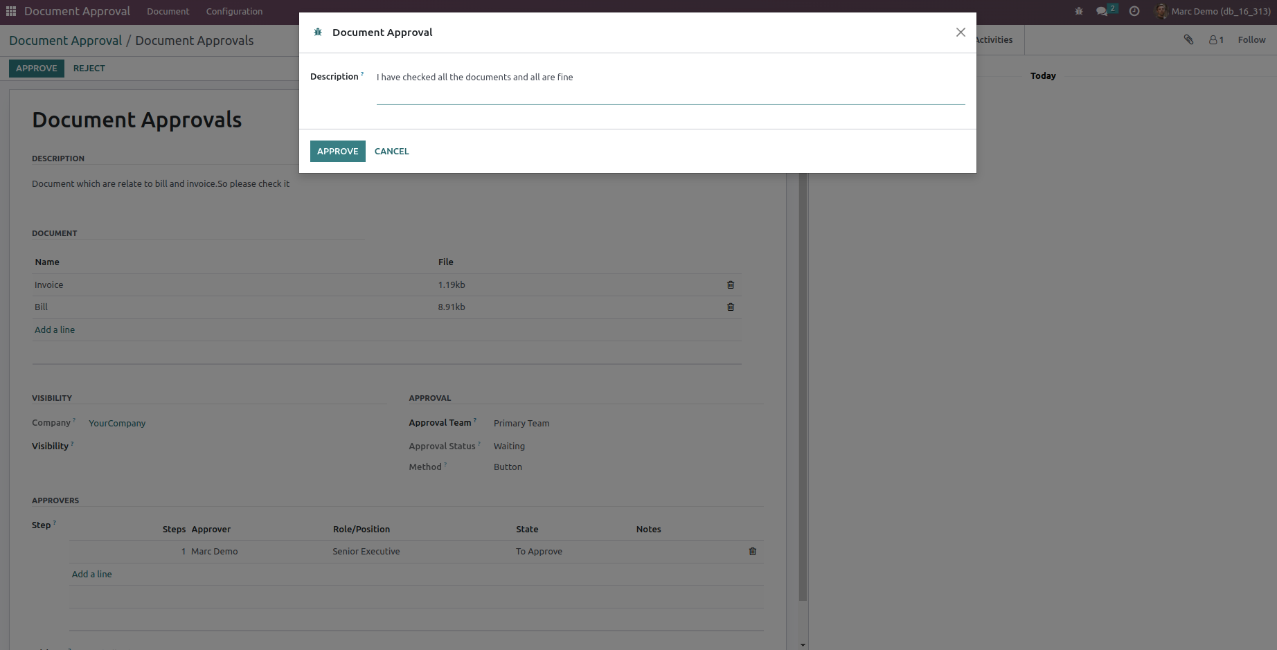 By clicking the APPROVE button from the wizard by adding notes we can see the document has been approved