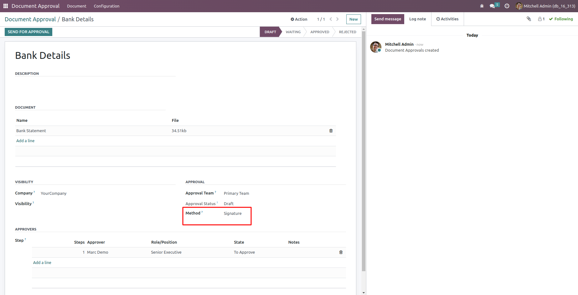Setting method as button and click APPROVE button we can see the wizard for the approvals