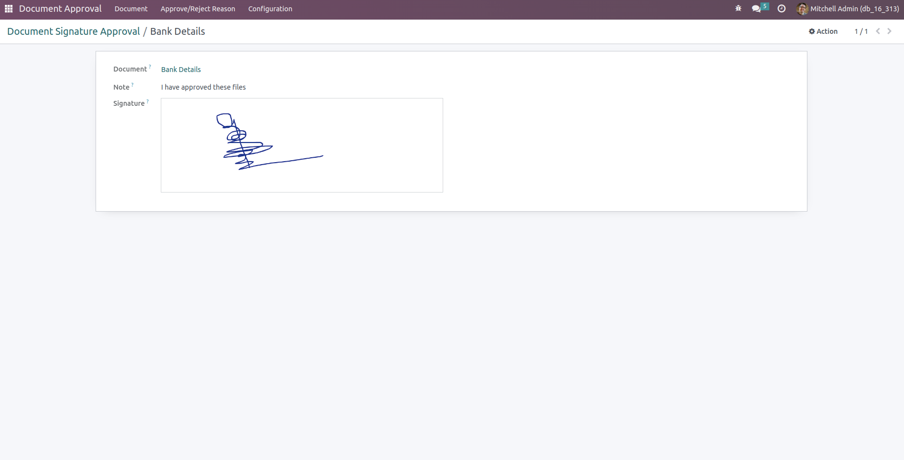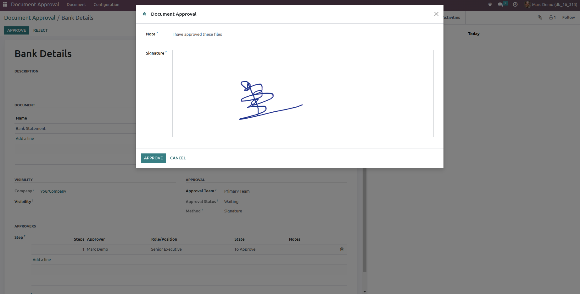 By clicking the approve button we can see a wizard with signature option put the signature and approve
