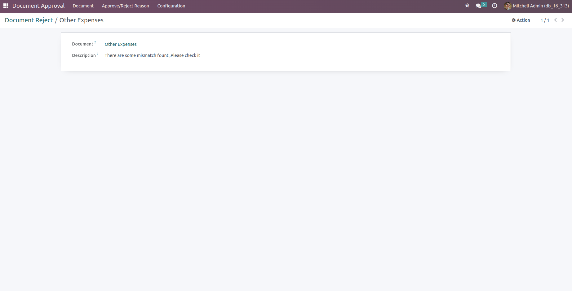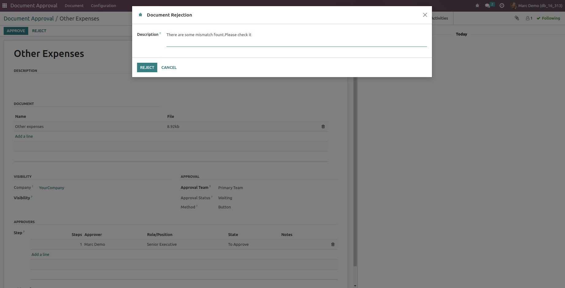 By clicking the REJECT button from the document approvals we can see the wizard for the document rejection.By clicking REJECT button from the wizard we can see the document has been set to rejected state