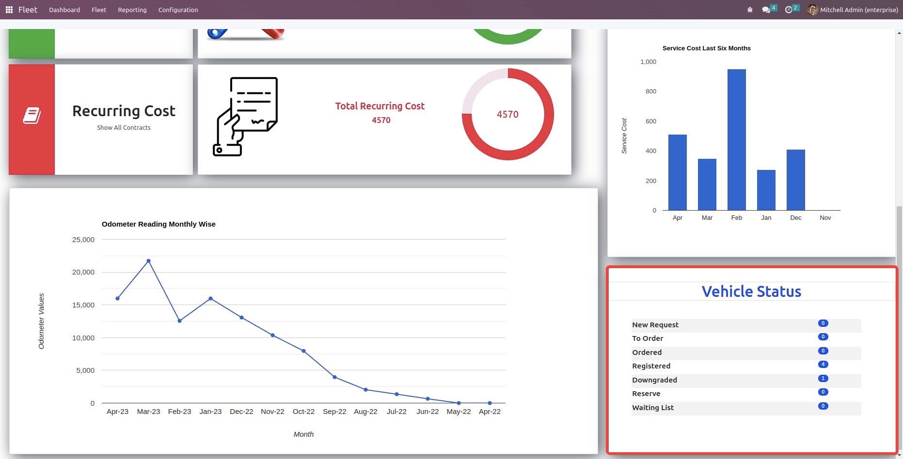 The Fleet Dashboard has different types of graphs that will give you a complete analysis of the Fleet Module.