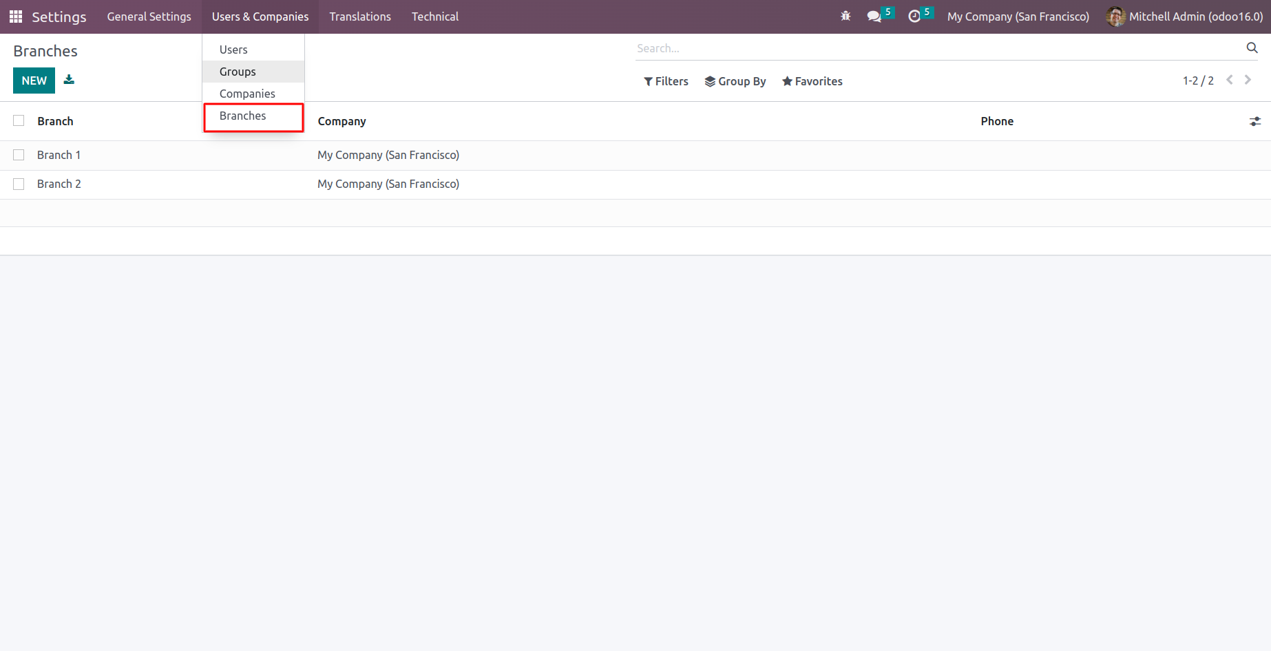 Administrator can create Branches for the company from Settings -> Users & Companies -> Branches -> Create