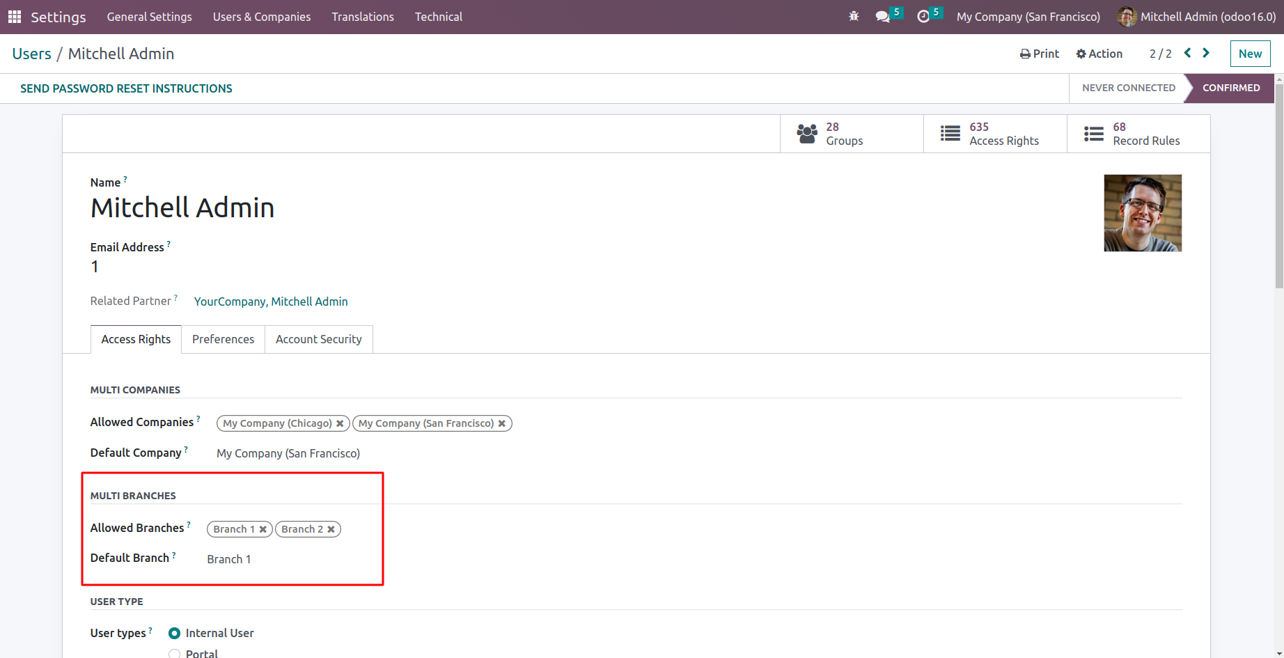 Allowed branches and default branch can be set for each user. The showing Branches will be based on the allowed Companies for the particular user
