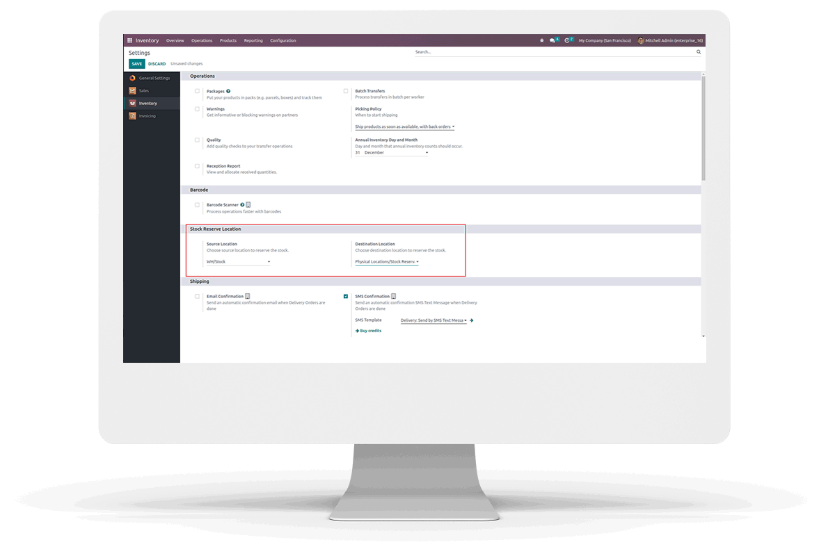 Under "Inventory" > "Configurations" > "Settings" user have to select source location and destination location to reserve stock.