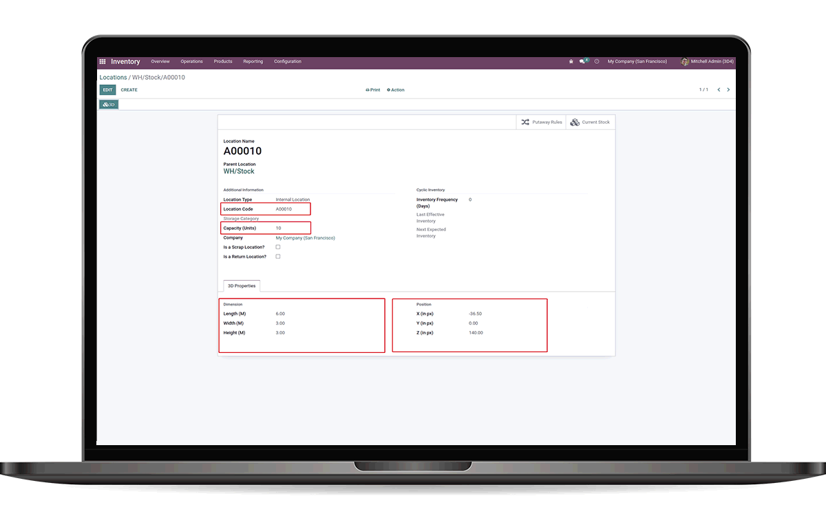 Enter the location properties such as location Code, Capacity, Dimension and Position along X,Y and Z axis.