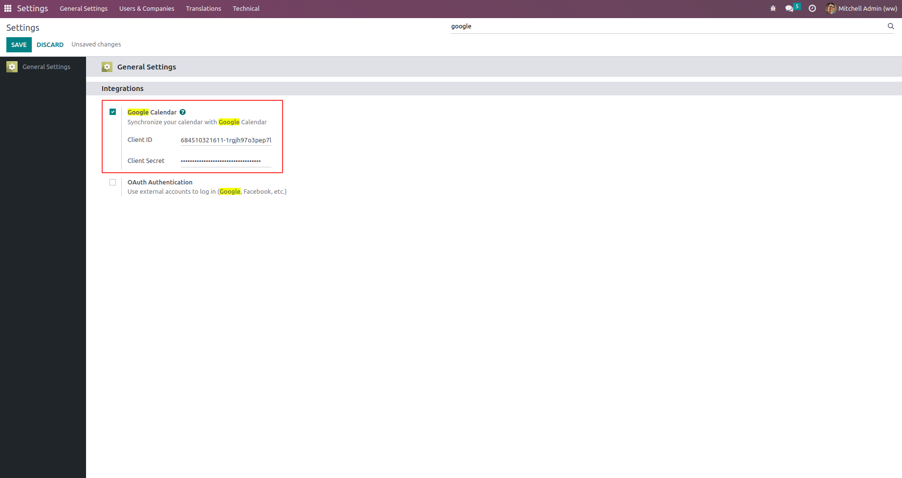Under Settings > integration > google calender, add client id and client secret then save .