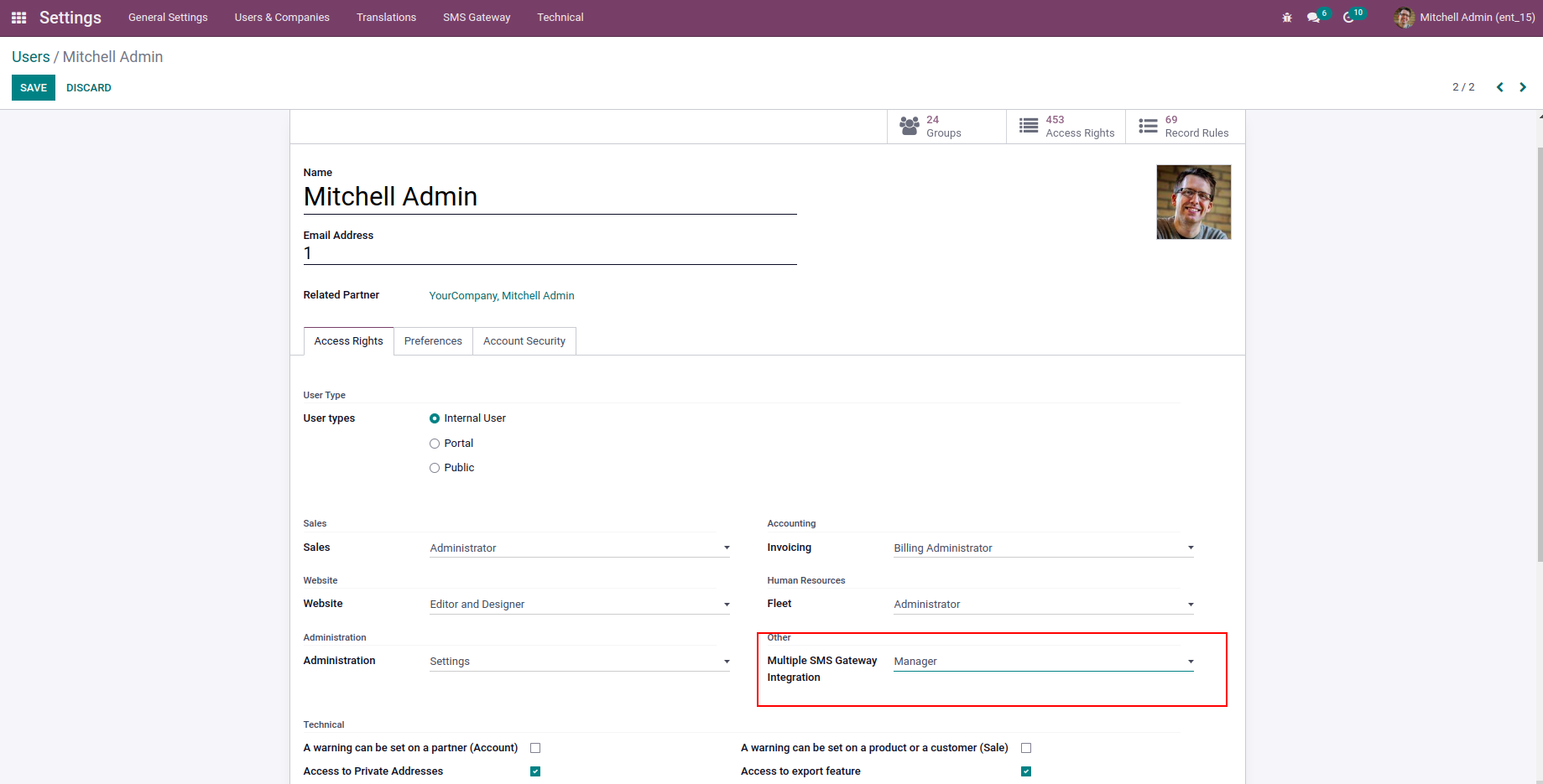 Select the access right for the Multiple SMS Gateway Integration module as Manager.