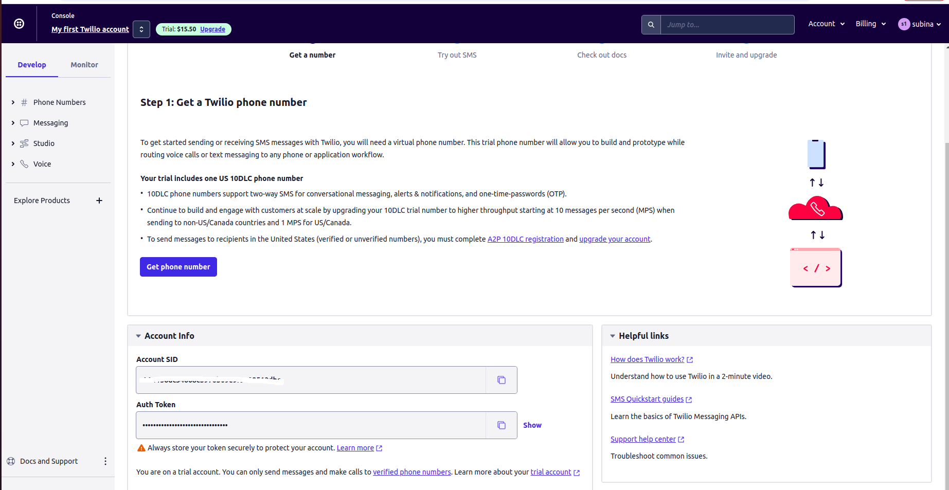 We get the credentials after that, And we can generate a twilio phone number by clicking on Get a phone number button