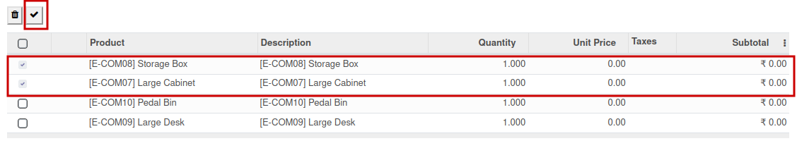 If we want to Select/Deselect a few order lines from a lengthy Sale Order/Purchase Order (Case: 10+ Order lines), We have two ways, individually delete orderline one by one from Purchase/Sale order or create a new order. This module eliminates this issue by introducing a new widget "Mass Select/ Deselect Widget"; which can be used in any One2Many fields to perform mass select/deselect
