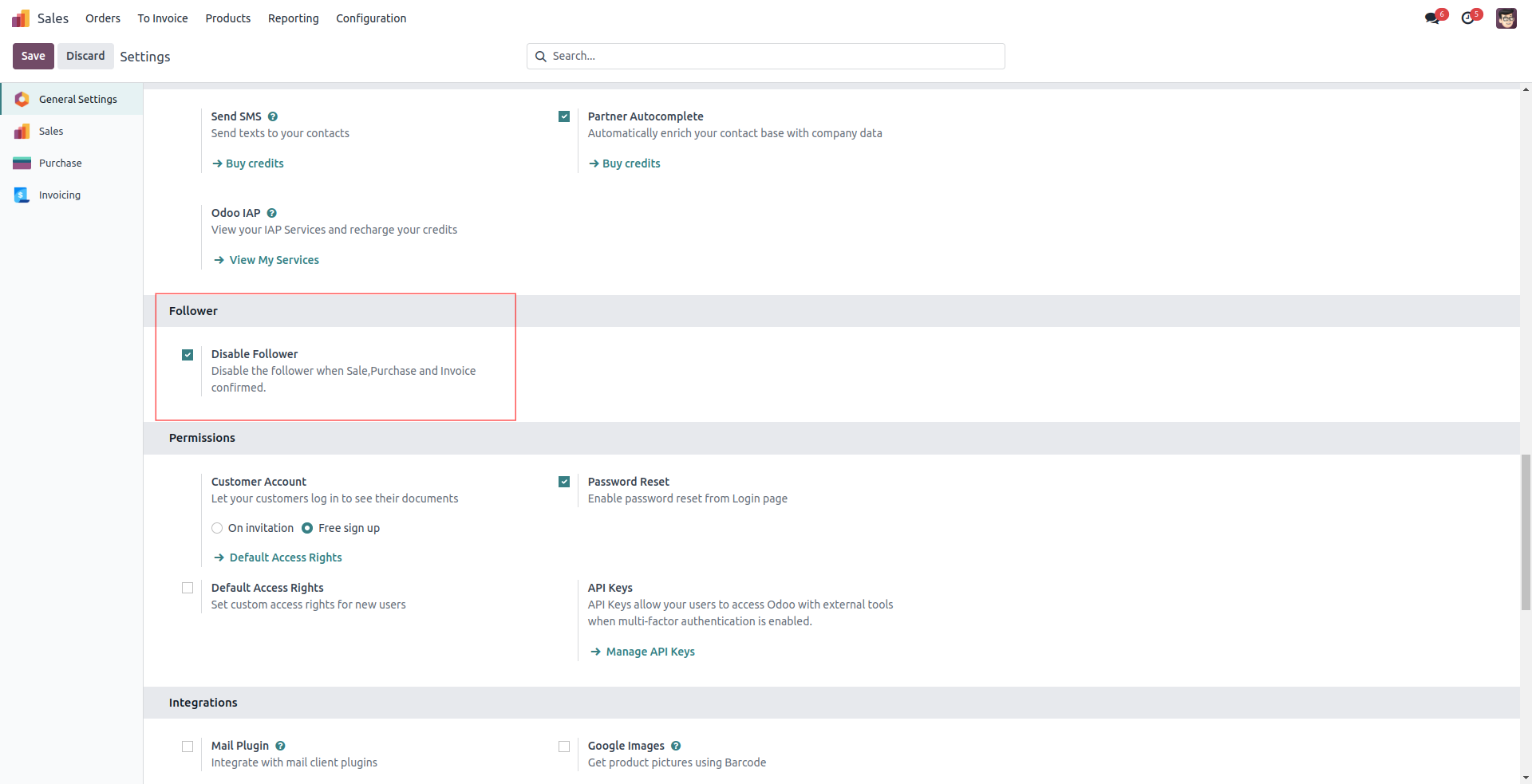 While confirming a Purchase Order, we can see that only the user is added to the follower. Here the vendor is restricted to be a follower.