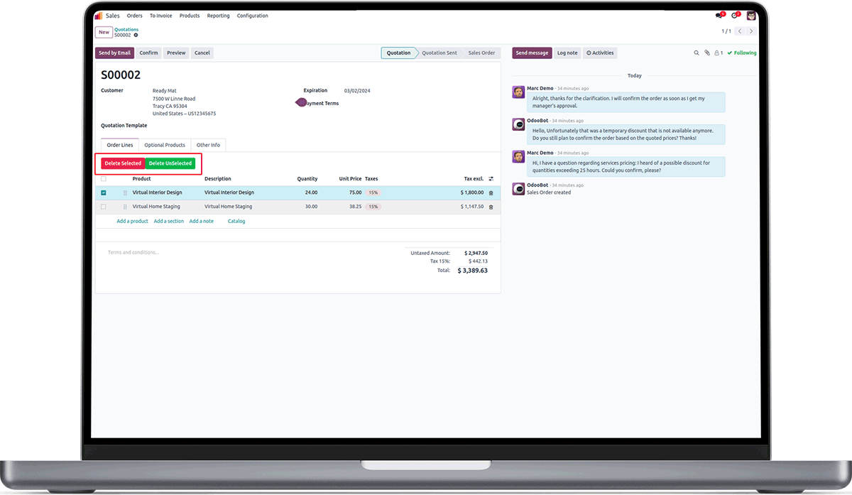 When we select a order line we can see two buttons Delete Selected and Delete UnSelected