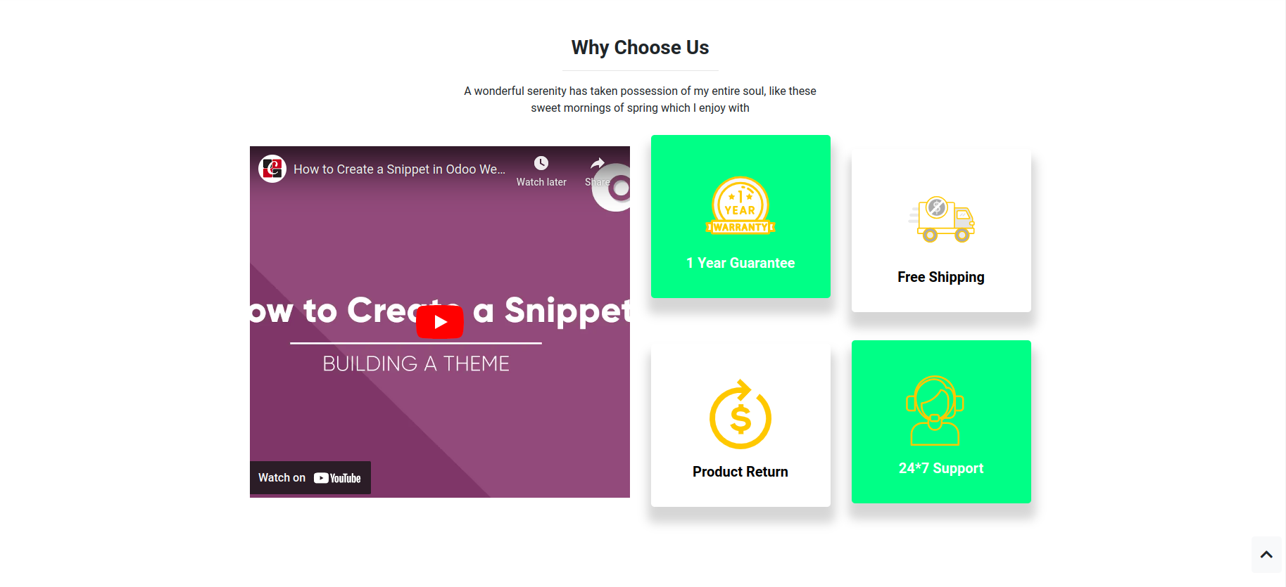 Provides Structural snippets like Features, Subscribe, Choose , Cards, Banner and Dynamic content snippets configured from the backend like Asked Questions, Best Deals, Best Products, Testimonial