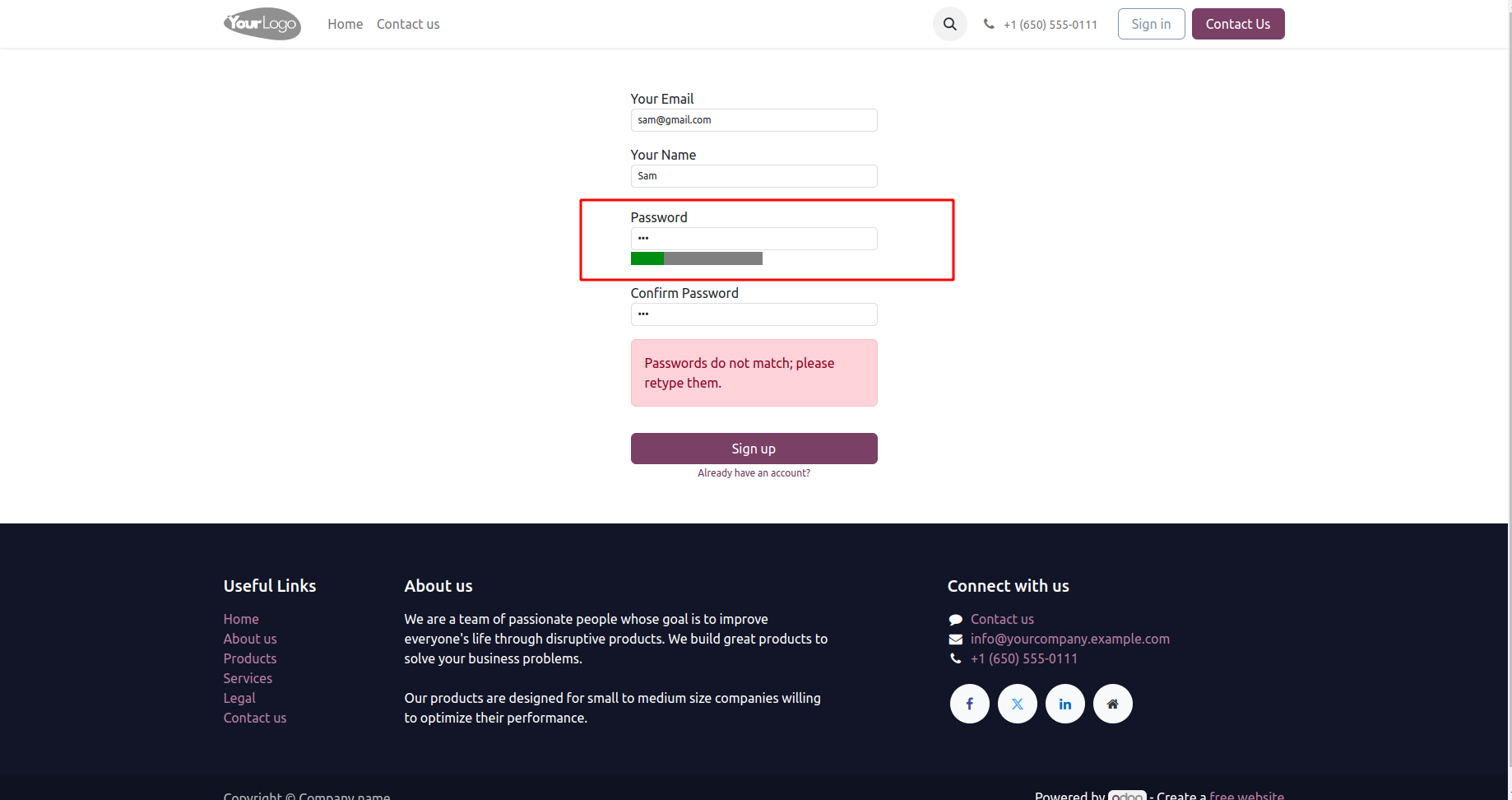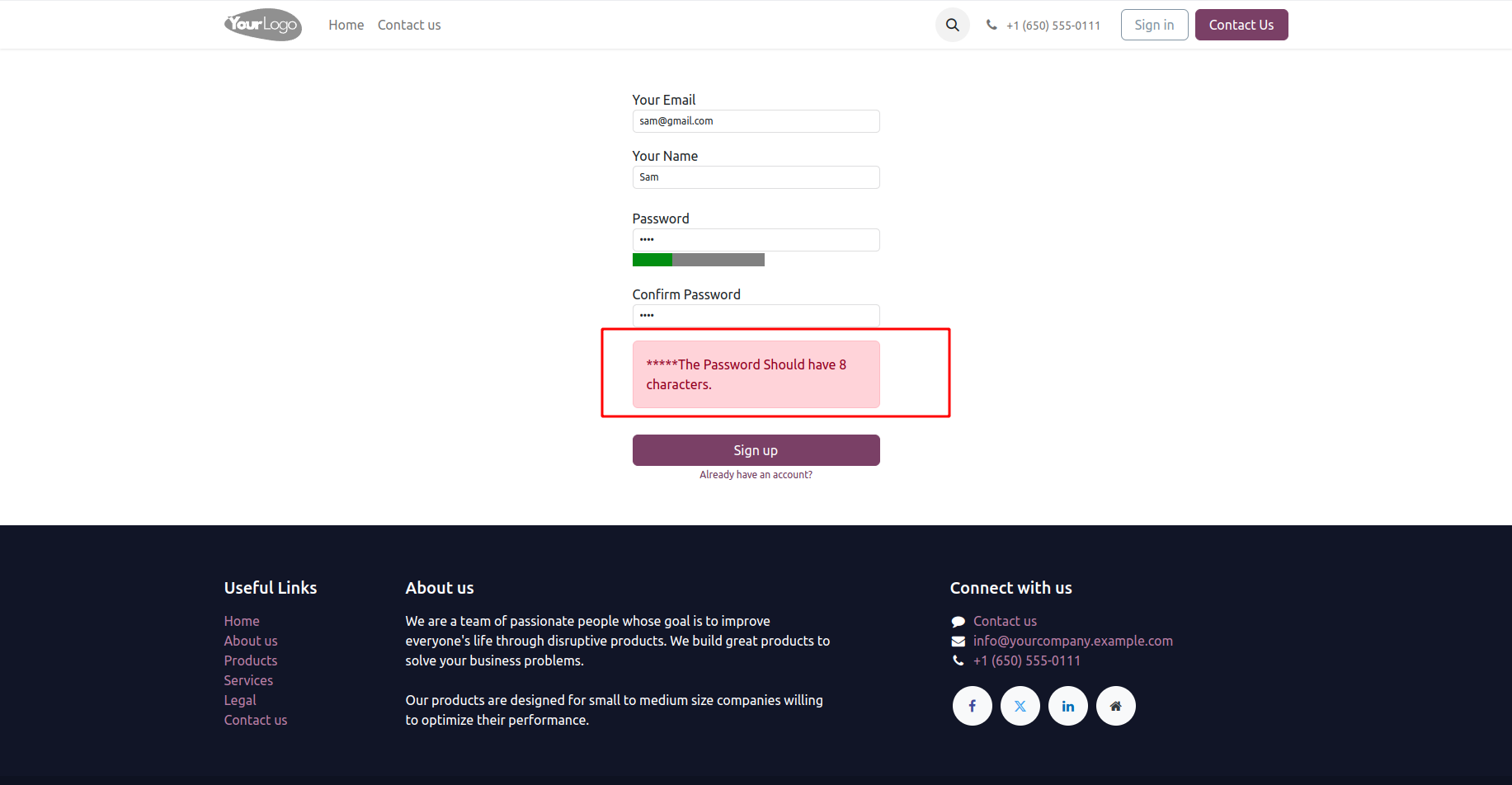 If selected conditions of the password is not satisfies the user password an error message will appear as warning about the conditions in signup form and restricting further signup.