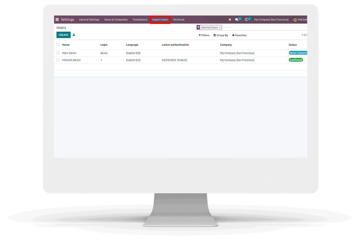 In default Odoo we need to configure users access rights after adding them into Odoo ERP system. This app allows to import users with User Name, Email ID, Language, User Type, Access Group, Access Technical Settings all these important fields.