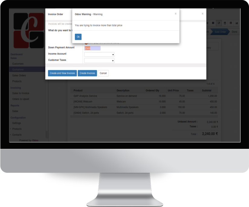 This Cybrosys's module allows you to get warning when a user try to pay down payment greater than sale order amount