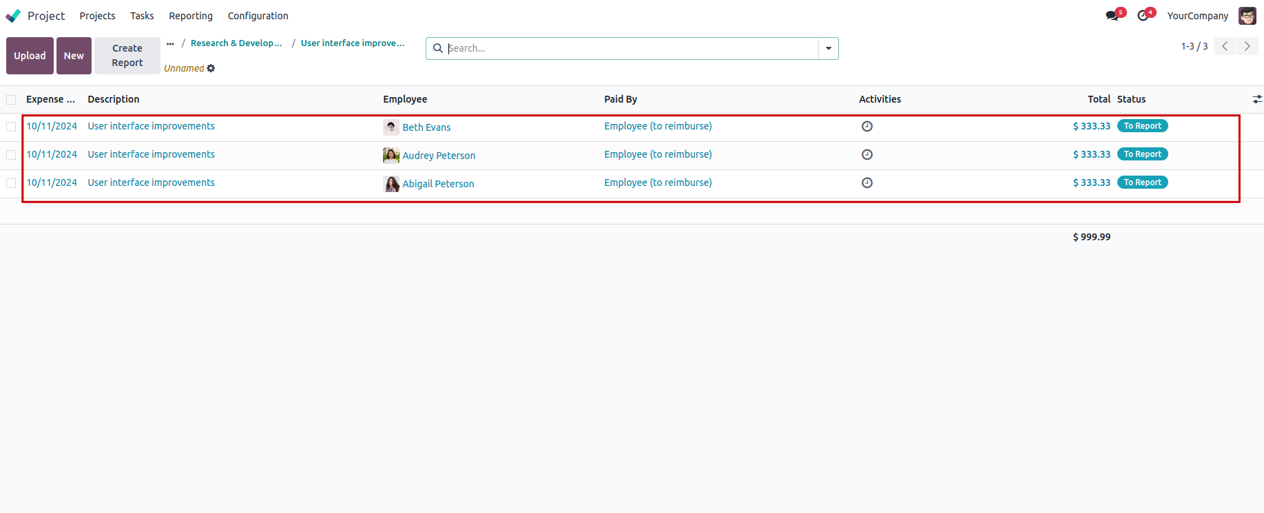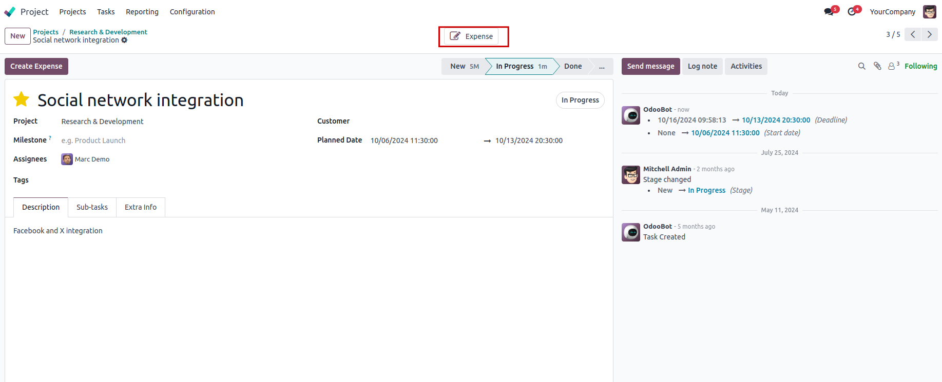 The Create Expense button could allow users to create multiple expenses for a single project task, which is useful for tasks that require multiple purchases or expenditures.