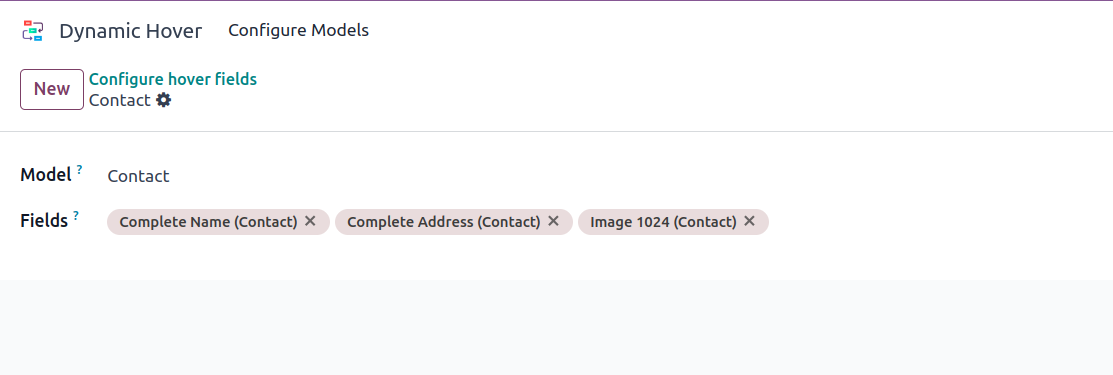 Go to Dynamic Hover -> New -> We can see the fields model and fields to configure.