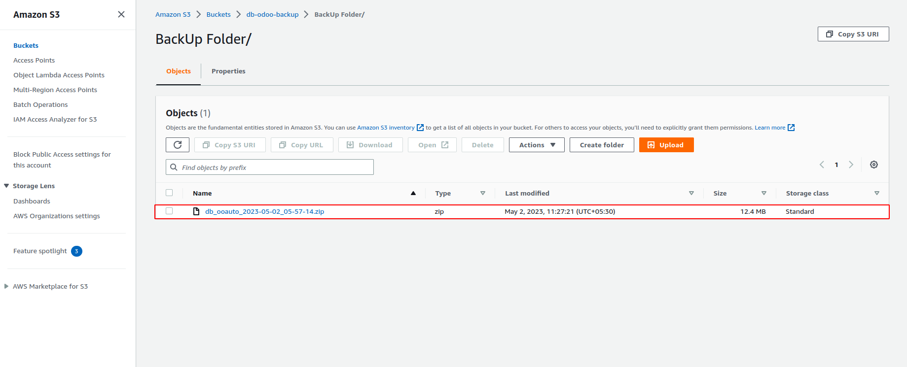 Every day, a Scheduled Action will take place to store a backup on the Amazon S3 Server. The backup will be stored as the folder name provided in the File Name field in Odoo.