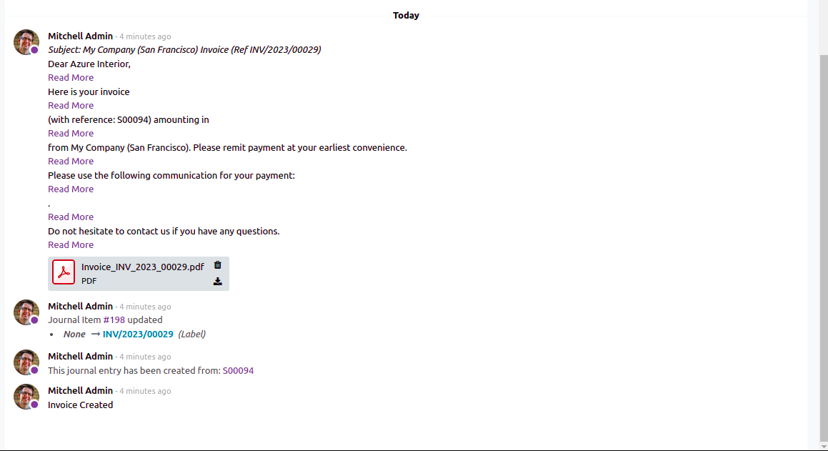 User can see invoice is validated automatically and sent message is linked with chatter which is sent to customer.