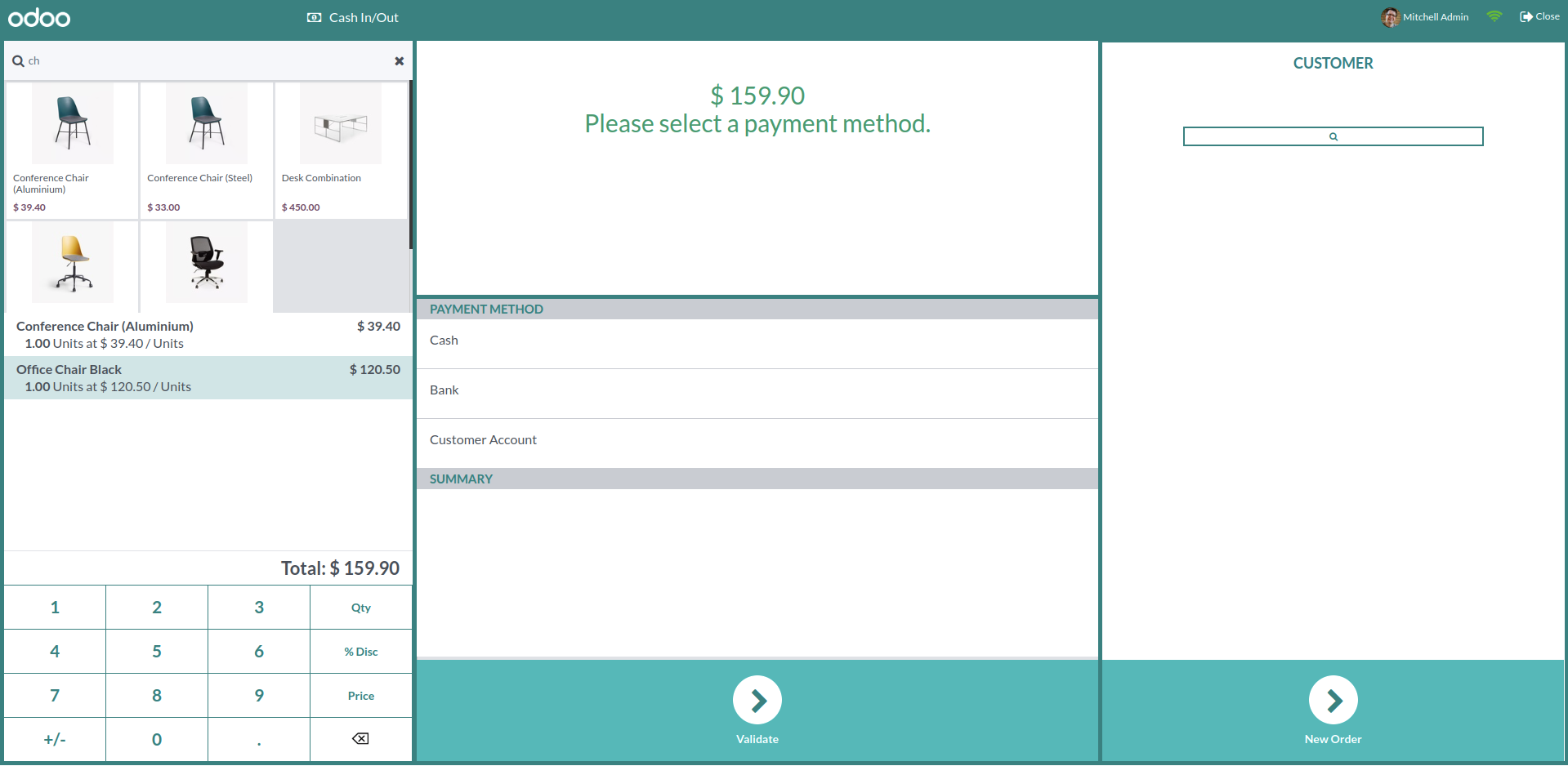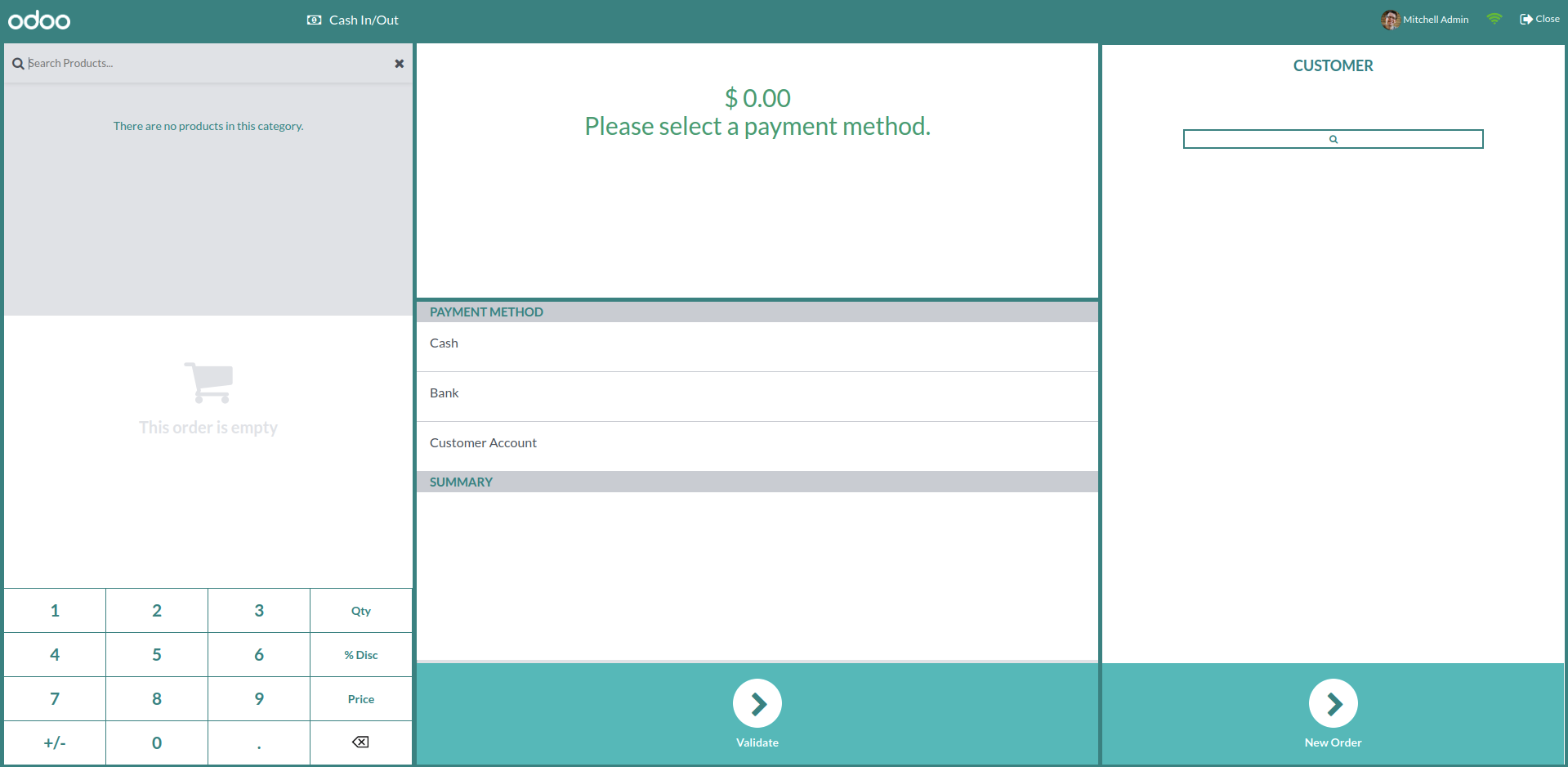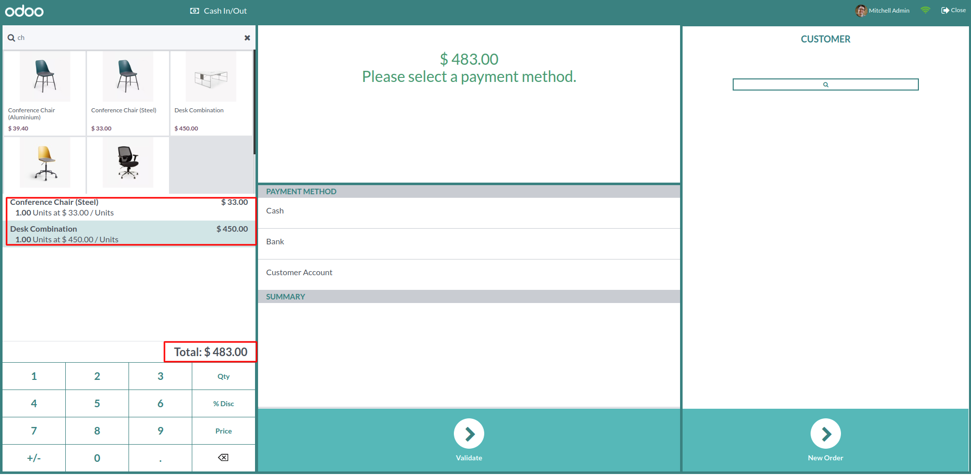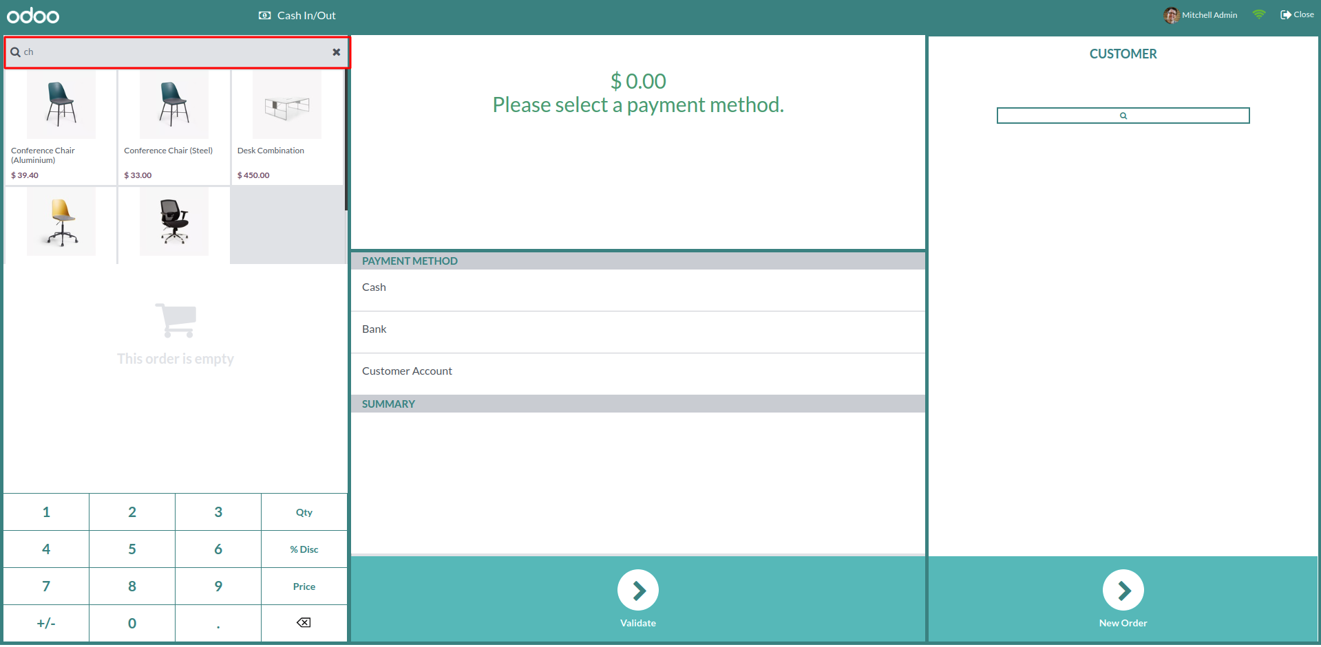 When a product is clicked, it is added to the order lines and the total is displayed beneath it. We can adjust the amount, price, and discount using the number pad.