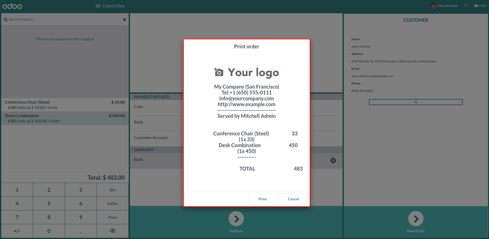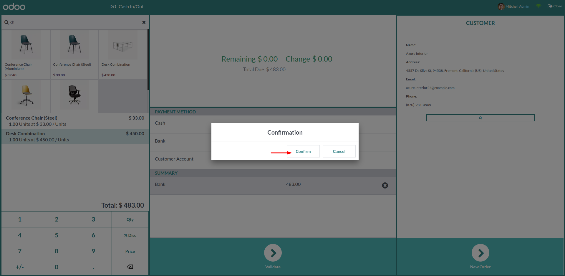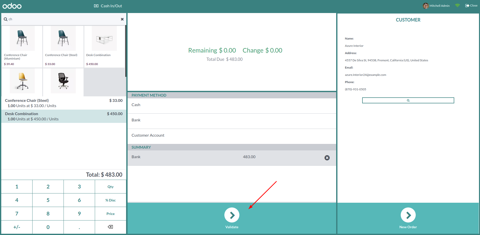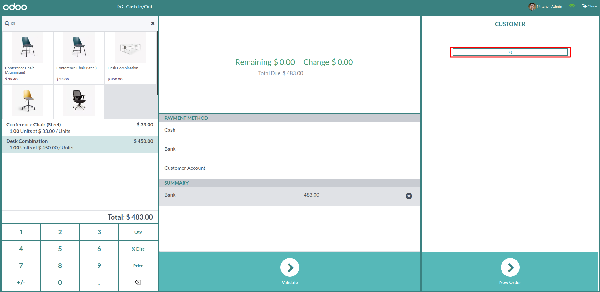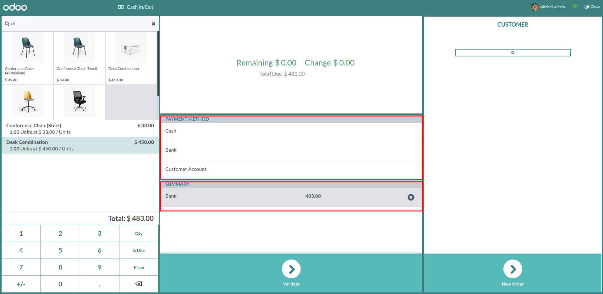 When a product is clicked, it is added to the order lines and the total is displayed beneath it. We can adjust the amount, price, and discount using the number pad.