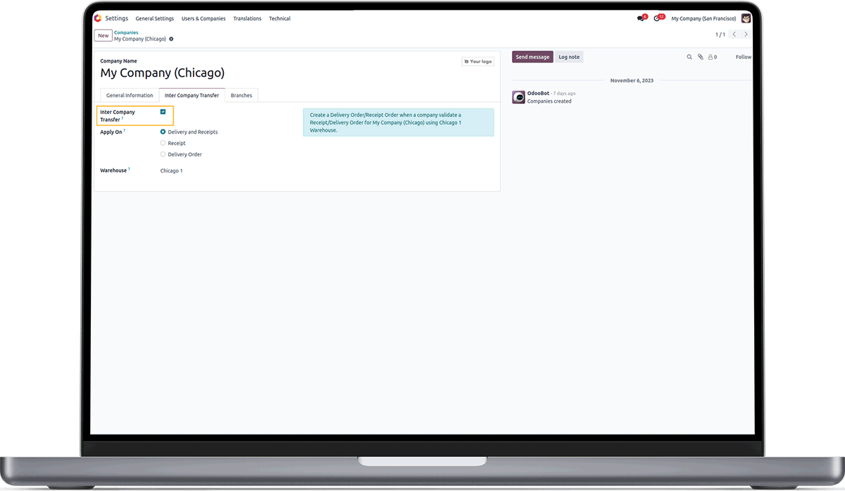 Inter Company Stock Transfer module will help to automatically create a Receipt/Delivery order if any company validates a Delivery order/Receipt to the selected company.