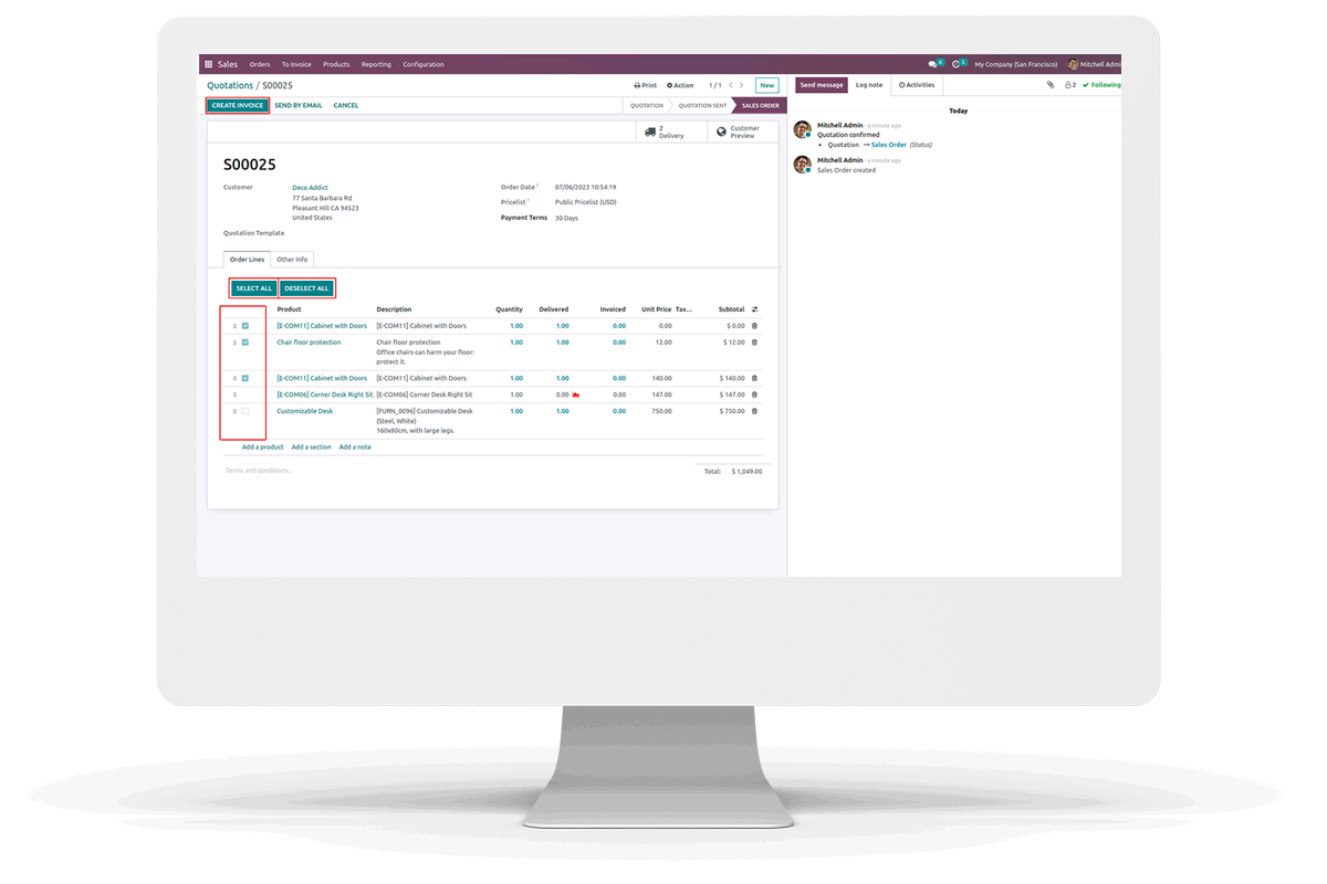 After confirming a Sale Order we can see the options for selecting and deselecting the products from sale order line. And click on the 'Create Invoice'.
