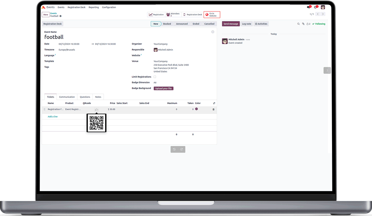 In Events, You can create new events and tickets, and can see the generated QR code here,we can go to website for the registration