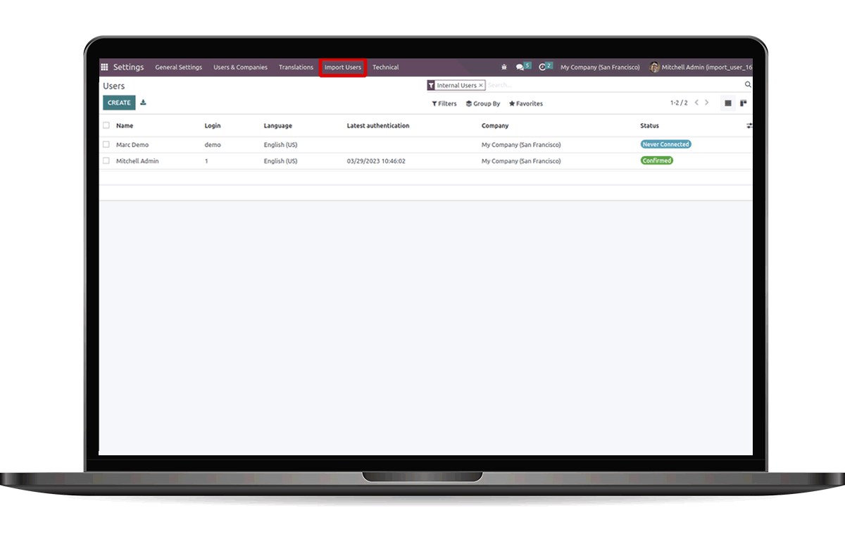 In default Odoo we need to configure users access rights after adding them into Odoo ERP system. This app allows to import users with User Name, Email ID, Language, User Type, Access Group, Access Technical Settings all these important fields.