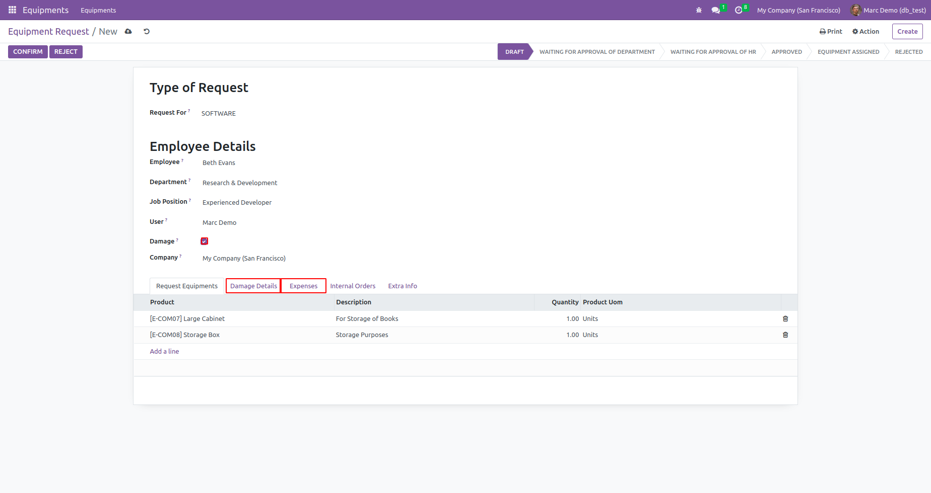 This module allows your employees to send requests to the Department Manager of Equipment for equipment type as equipment requests and equipment damage expense reimbursement requests.