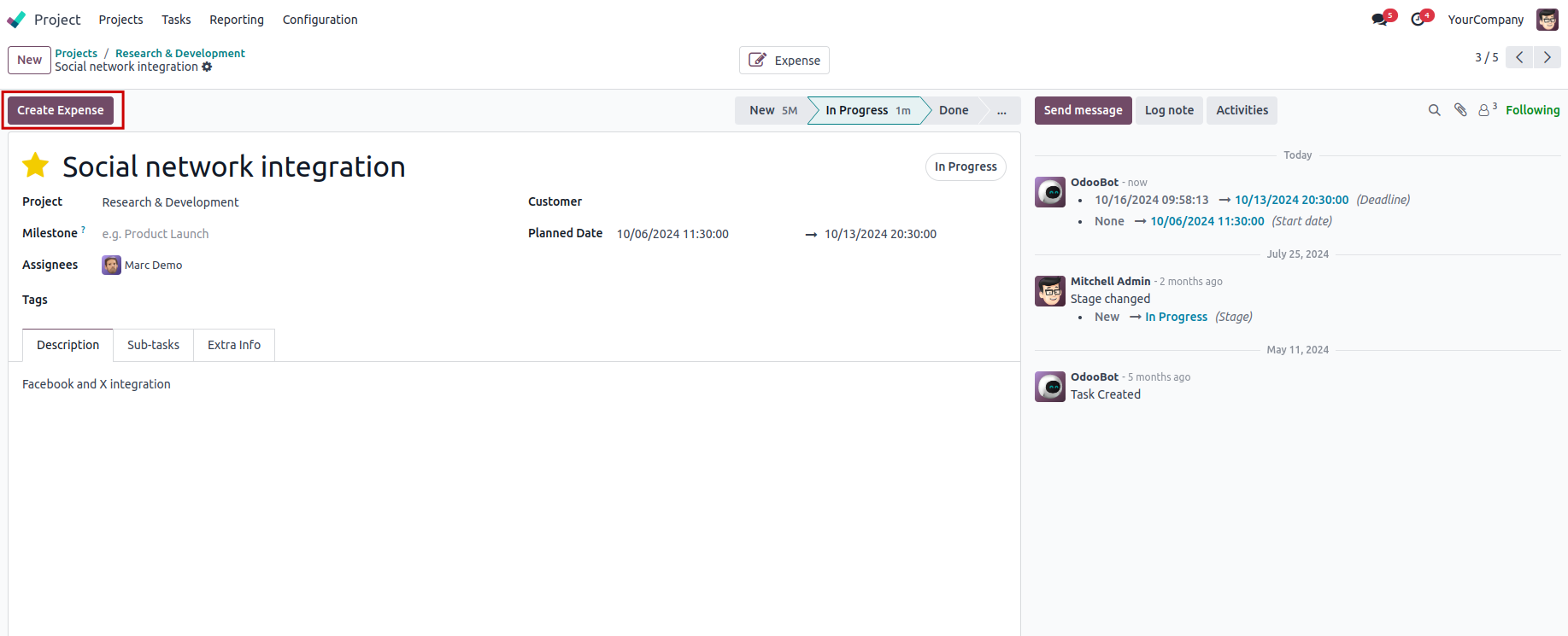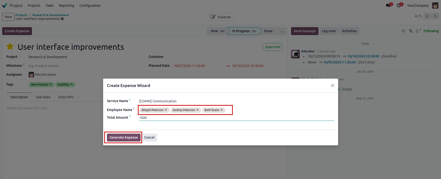 The Create Expense button could allow users to create multiple expenses for a single project task, which is useful for tasks that require multiple purchases or expenditures.