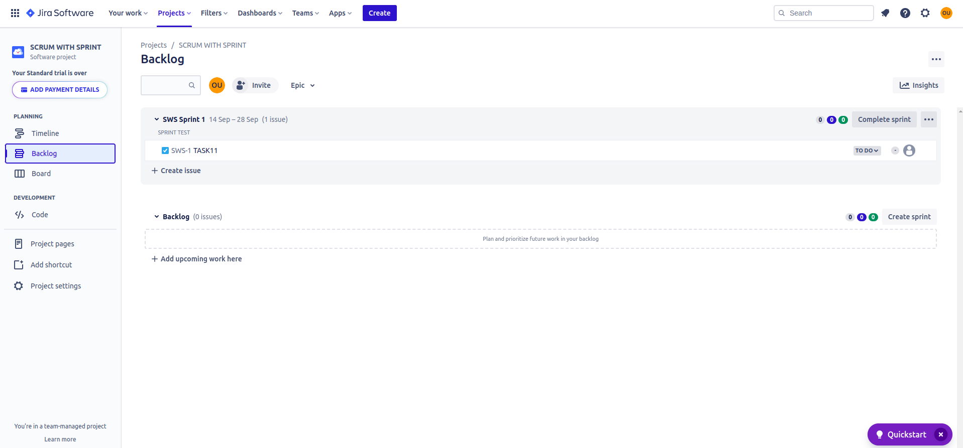 you can add a sprint in that project from Jira.