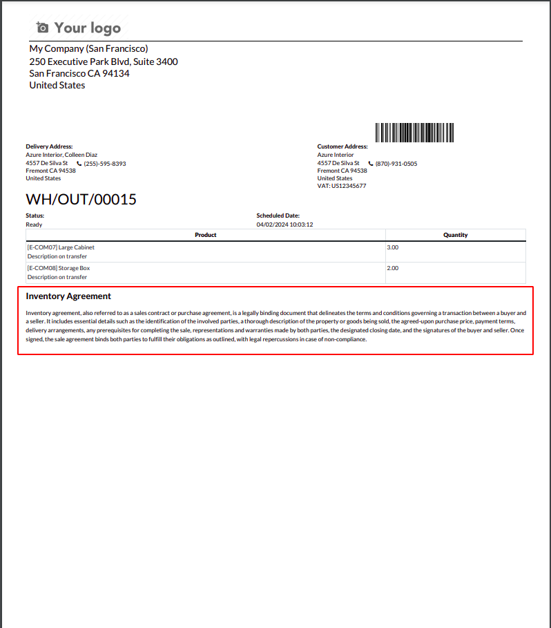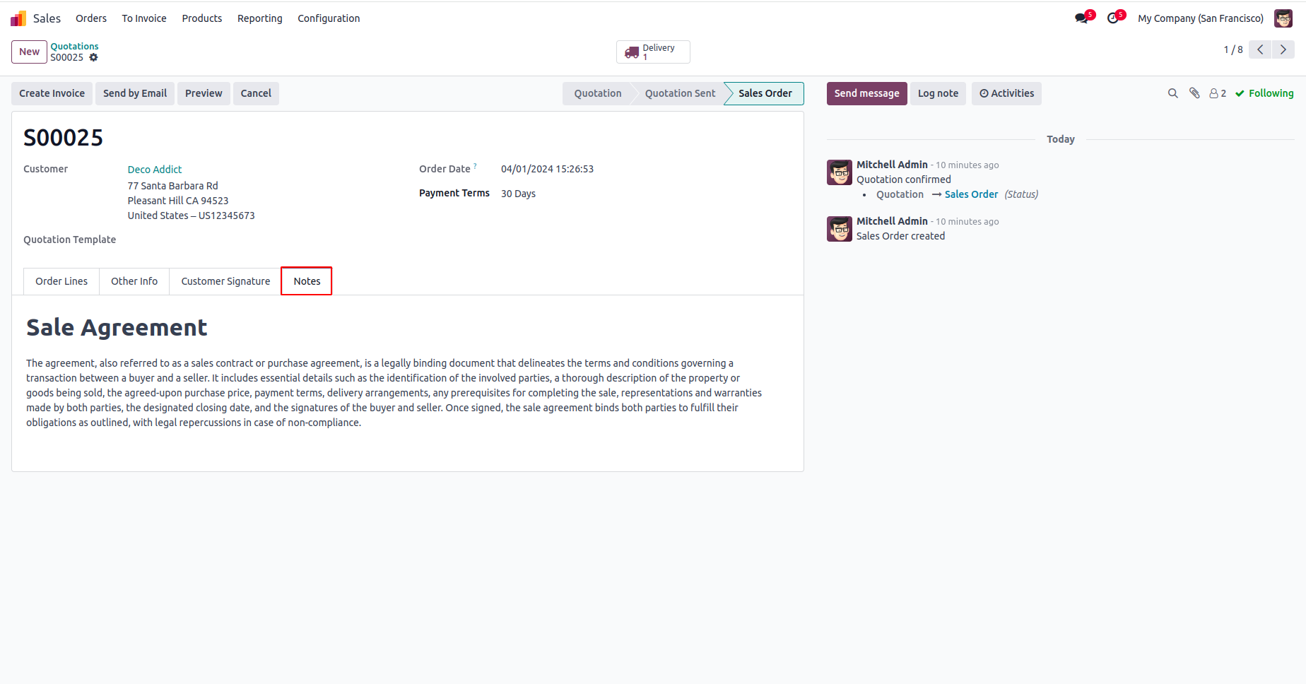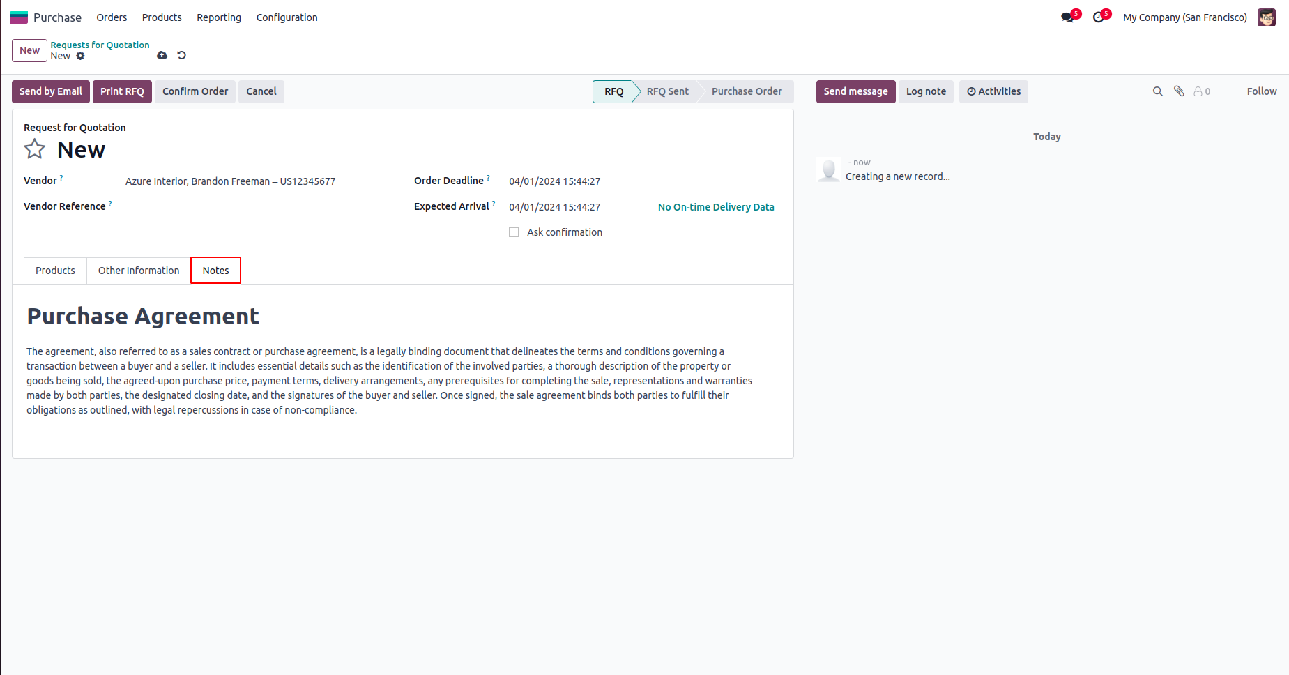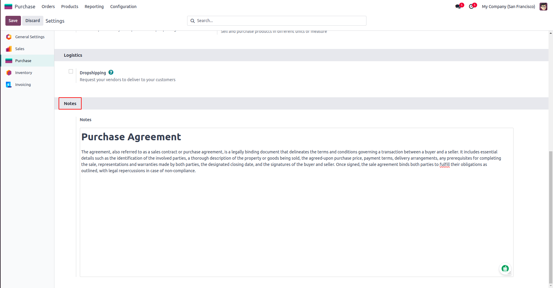 Setup HTML notes in configuration and used this default notes or customized notes in sales,purchase,invoice and inventory form view and also used this notes in reports.